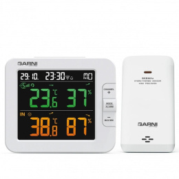Chytrý viackanálový teplomer s vlhkomerom, model GARNI 419T má vstavaný modul WiFi a prostredníctvom svojho chytrého systému je kompatibilný s platformou Tuya IOT. Pomocou aplikácie Tuya Smart môžete sledovať teplotu a relatívnu vlhkosť hlavnej jednotky a bezdrôtových čidiel, kontrolovať históriu záznamov, nastavovať alarmy pre dané veličiny, spúšťať pokročilé funkcie za pomocou nameraných hodnôt a nameraná dáta odoslať na email v Excel súbore. Je možné ho prepojiť s ďalšími produktmi chytrej domácnosti, ovládanie potom prebieha cez aplikáciu v mobilnom zariadení. Hlavná jednotka aj bezdrôtové čidlo sú osadené švajčiarskymi čidlami SENSIRION. TUYA spolupracuje s platformou pre chytrú domácnosť Tuya pripojenie k miestnej Wi-Fi sieti 2,4 GHz spolupracuje s aplikáciou Tuya Smart jazykové mutácie aplikácie - čeština, slovenčina, angličtina farebný inverzný LCD displej o rozmeroch 90 x 81 mm stále osvetlený displej, 2 stupne jasu, nastavenie kontrastu v 15 úrovniach veľkosť číslic na displeji – čas 9 mm, dátum, skratka názvu dňa 7,5 mm, teplota 21,5 mm, relatívna vlhkosť 21 mm farby na displeji – čas, dátum, skratka názvu dňa biela, vnútorná teplota a rel. vlhkosť oranžová, vonkajšia teplota a rel. vlhkosť zelená meranie vnútornej a vonkajšej teploty a relatívnej vlhkosti zobrazenie teploty vo °C, alebo °F švajčiarska čidla SENSIRION možnosť použiť až 7 bezdrôtových čidiel (GARNI 055H, bazénové čidlo GARNI 057P) indikácia vnútornej tepelnej pohody 3 ikonami možnosť kalibrácie teploty a rel. vlhkosti vo vnútri i na jednotlivých kanáloch bezdrôtový prenos hodnôt vonkajšej teploty a relatívnej vlhkosti na frekvencii 868 MHz ikona sily signálu z bezdrôtových čidiel ikona pripojenia k miestnej Wi-Fi sieti pamäť na maximálne a minimálne namerané denno a celkové hodnoty teploty a relatívnej vlhkosti šípka vývoja teploty a rel. vlhkosti čas a dátum riadené z internetu s možnosťou manuálneho nastavenia budík s možnosťou opakovania bdenia (Snooze) po 5 minútach budicí signál - 4 sekundy 1 pípnutie za sekundu, 4 sekundy 2 pípnutia za sekundu, 4 sekundy 3 pípnutia za sekundu a potom stále 4 pípnutia za sekundu ikona slabých batérií možnosť aktualizácie firmware farba hlavnej jednotky biela napájanie sieťovým adaptérom a záložnou batériou možnosť postavenia a zavesenia Bezdrôtové čidlo GARNI 055H odolné voči vlhkosti meranie teploty a relatívnej vlhkosti švajčiarske čidla SENSIRION 7 kanálov možnosť postavenia a zavesenia farba biela možnosť postavenia a zavesenia napájanie batériami 2 ks typ AA (tužkové, nie sú súčasťou balenia) Obsah balenia hlavná jednotka 1 ks bezdrôtového čidla GARNI 055H síťový adaptér návod CZ, SK, EN, DE, PL, HU, NL