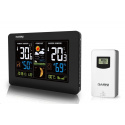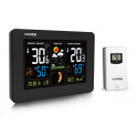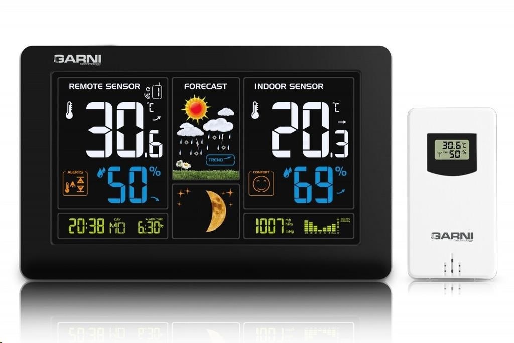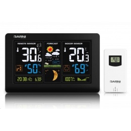 Meteorologická stanica so špičkovým inverzným farebným VA displejom s časovo riadeným rádiovým signálom DCF-77, budíkom, meraním vnútornej teploty, relatívnej vlhkosti a absolútneho barometrického tlaku, bezdrôtovým čidlom na meranie vonkajšej teploty a relatívnej vlhkosti a USB portom na nabíjanie externých zariadení inverzný farebný VA displej o rozmeroch 167 x 93 mm s možnosťou trvalého osvetlenia pri napájaní sieťovým adaptérom alebo krátkodobým osvetlením na 15 s pri napájaní batériami 4 stupne jasu osvetlenia displeja, možnosť vypnutia osvetlenia displeja s možnosťou krátkodobého osvetlenia na 15 s (pri napájaní sieťovým adaptérom) veľkosť číslic na displeji – čas, dátum, barometrický tlak 8 mm, skratka názvu dňa 6 mm, vnútorná a vonkajšia teplota 30 mm, vnútorná a vonkajšia relatívna vlhkosť 20 mm čas a dátum riadené signálom DCF-77 s možnosťou manuálneho nastavenia ikona príjmu signálu DCF-77 skratka názvu dňa 12-hodinový alebo 24-hodinový formát zobrazenia času možnosť nastavenia časového pásma od -12 do +12 hodín budík s funkciou opakovaného budenia (Snooze) po 5 minútach budící signál - 10 sekúnd 1 pípnutie za sekundu, 10 sekúnd 2 pípnutia za sekundu, 10 sekúnd 4 pípnutia za sekundu a potom stále 8 pípnutí za sekundu 6 animovaných ikon predpovede počasia (slnečno, polooblačno, oblačno, zrážky, silný dážď a sneženie) na základe sledovania barometrického tlaku vestaveným barometrom zobrazenie hodnôt vnútorná a vonkajšia teplota a relatívna vlhkosť pamäť na maximálne a minimálne namerané hodnoty teploty a rel. vlhkosti s automatickým vymazaním o 0:00 meranie absolútneho barometrického tlaku (mb / hPa alebo inHg) šipky tendencie vývoja absolútneho barometrického tlaku, vnútorná a vonkajšia teplota a relatívna vlhkosť možnosť nastavenia alarmu horného a dolného okraja vonkajšej teploty v rozsahu od -20°C do +60°C (akustický signál a ikona na displeji) pre každý kanál zvlášť s indikáciou námrazy v rozsahu od -1°C do +3°C zobrazenie teploty vo °C alebo °F možnosť použitia až 3 bezdrôtových čidl GARNI 30H (jedno čidlo GARNI 030H je súčasťou balenia) funkcia automatického prepínania kanálov 5 ikôn vnútorného tepelnú pohodu bezdrôtový prenos hodnôt vonkajšej teploty a relatívnej vlhkosti na frekvencii 433 MHz ikona príjmu signálu bezdrôtového čidla zobrazenie fázy Mesiaca USB port na nabíjanie mobilných zariadení (len pri napájaní hlavnej jednotky sieťovým adaptérom), maximálny nabíjací prúd 1000 mA ikony slabých batérií napájanie sieťovým adaptérom alebo batériami možnosť postavenia alebo zavešenia farba čierna Bezdrôtové čidlo GARNI 030H odolné voči vlhkosti displej o rozmeroch 19 x 11 mm veľkosť číslic na displeji: teplota a relatívna vlhkosť 4 mm meranie teploty a relatívnej vlhkosti 3 kanály maximálny RF výkon 10 dBm (10 mW) možnosť postavenia a zavešenia farba biela Obsah balenia: 1 x hlavná jednotka GARNI 545 Line 1 x bezdrôtové čidlo GARNI 030H 1 x sieťový adaptér český, slovenský, nemecký, anglický, taliansky, poľský a maďarský návod