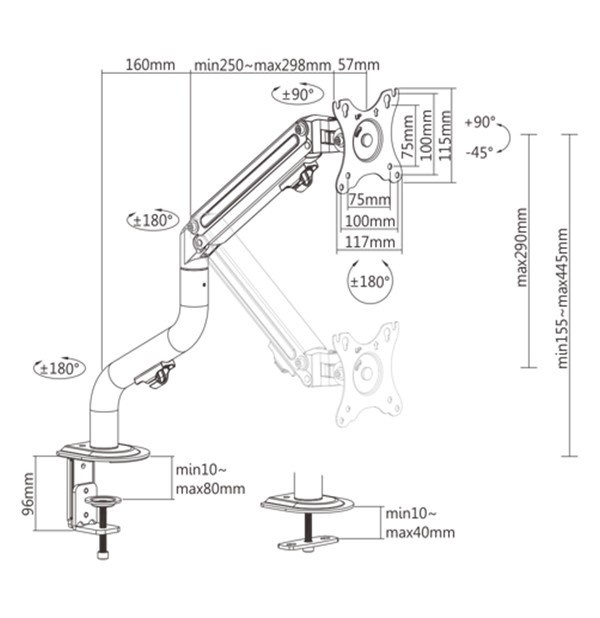 • Odolné nastaviteľné plynové pružiny vhodné pre monitory 2 - 8 kg