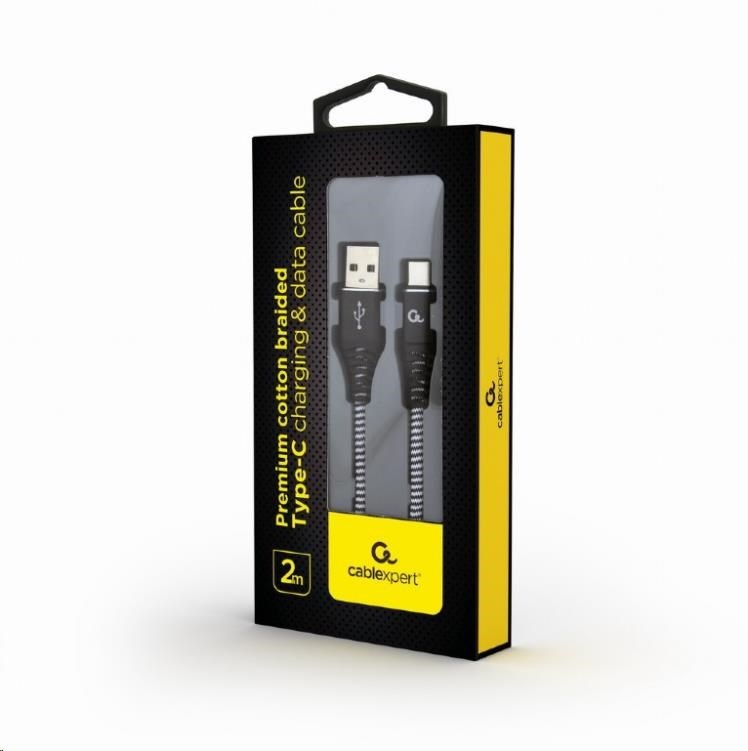 Prémiový bavlnený opletený nabíjací a dátový kábel USB typu C, 2 m, čierny/biely
