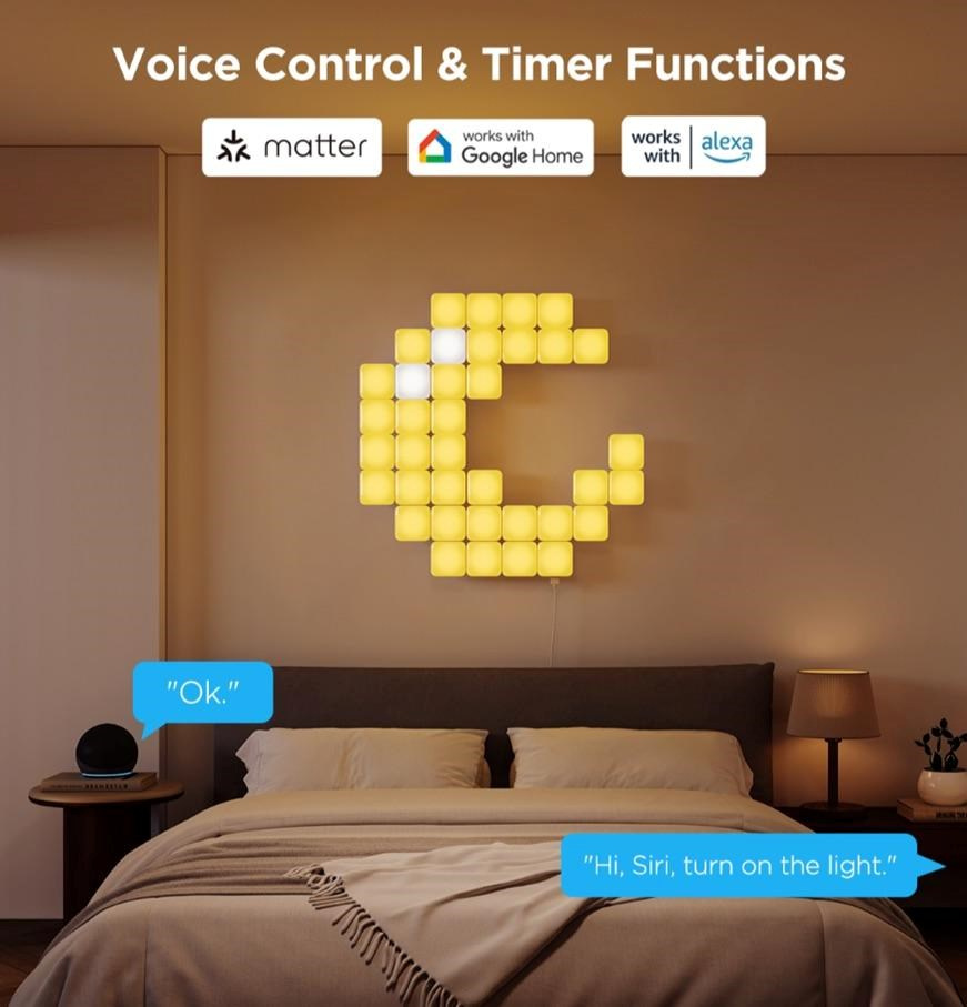 Vychutnajte si pohodlie inteligentného ovládania vďaka kompatibilite s aplikáciami Matter, Google Home, Amazon Alexa a Siri. Stačí jediný hlasový príkaz a vaše panelové svietidlá Govee Mini sa prispôsobia presne vašim potrebám – či už ide o zapnutie, zmenu farby alebo nastavenie intenzity. Vďaka funkcii časovača môžete osvetlenie jednoducho naplánovať podľa svojho denného rytmu a kedykoľvek vytvoriť dokonalú atmosféru.