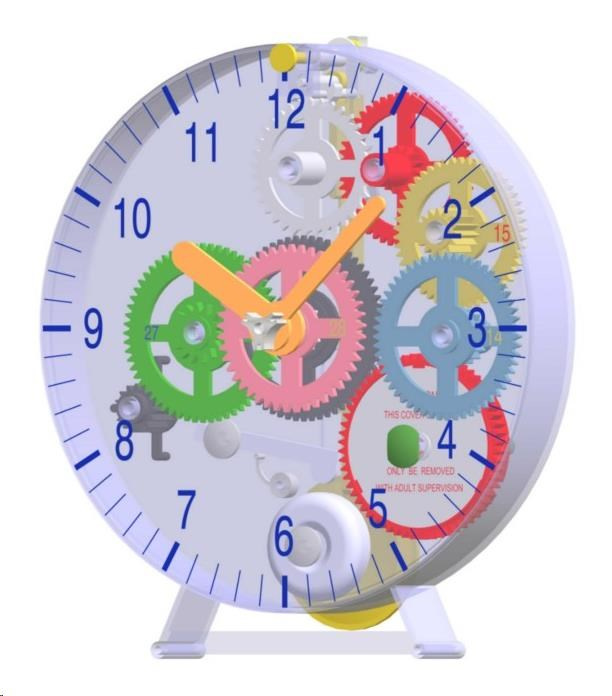 • detská stavebnica analógových mechanických hodín • poháňané pružinou • materiál plast • nevhodné pre deti do 3 rokov • priemer ciferníka 196 mm • priehľadný kryt, farebné diely