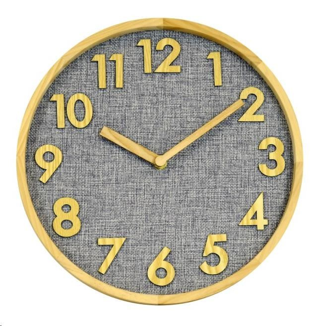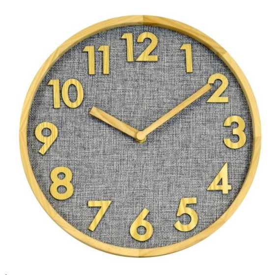 • analógové nástenné hodiny • čas riadený kryštálom • materiál kompozitné drevo • priemer ciferníka 300 mm • napájanie 1 ks batérie typ AA 1,5 V (tužková, nie je súčasťou balenia) • ciferník látka, číslice s dreveným vzorom
