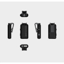 The kit includes both a camera-mount receiver (3.5 mm TRS + USB-C out) and a USB-C receiver. The pack also supports real-time wireless monitoring (with optional OWS earphones) and offers up to 36 hrs runtime from the included charging case. Connectivity extends to both cameras and mobile devices, with lightning adapters included.