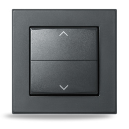 Kryt kolébkového vypínača so symbolmi šípok a rámečkom v antracitovej farbe (HmIP-BRA-A) pre programovateľné bezdrôtové akčné členy (HmIP-BRC2, HmIP-BROLL, HmIP-BBL, HmIP-BSM, HmIP-BDT) o veľkosti 55 mm je súčasťou systému inteligentnej domácnosti Homematic IP.