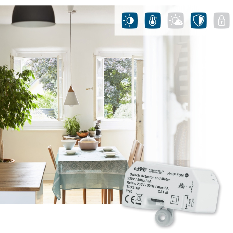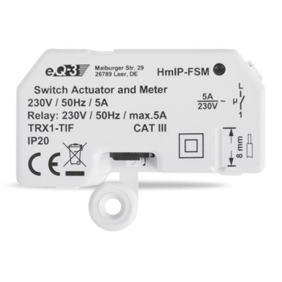 Programovateľný bezdrôtový Spínací akčný člen s meraním (HmIP-FSM) pre skrytú montáž, napájaný zo siete 230 V, je súčasťou systému inteligentnej domácnosti Homematic IP.