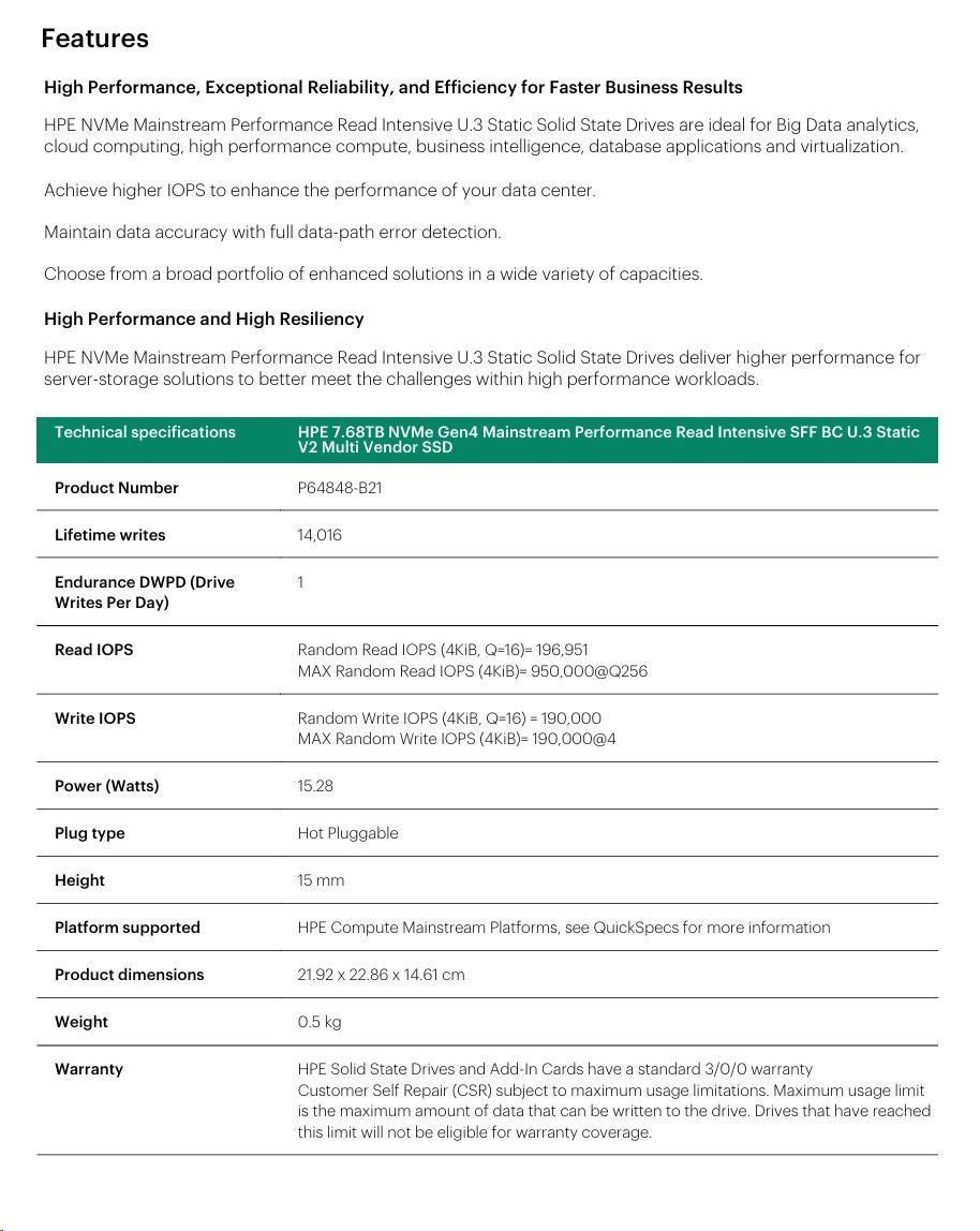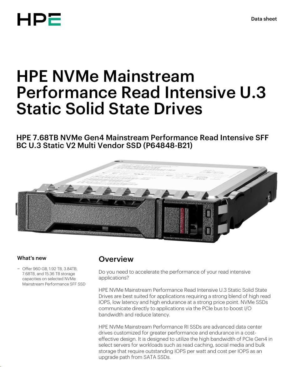 HPE 7.68TB NVMe Gen4 Mainstream Performance Read Intensive SFF BC U.3 Static V2 Multi Vendor SSD P64848-B21 RENEW