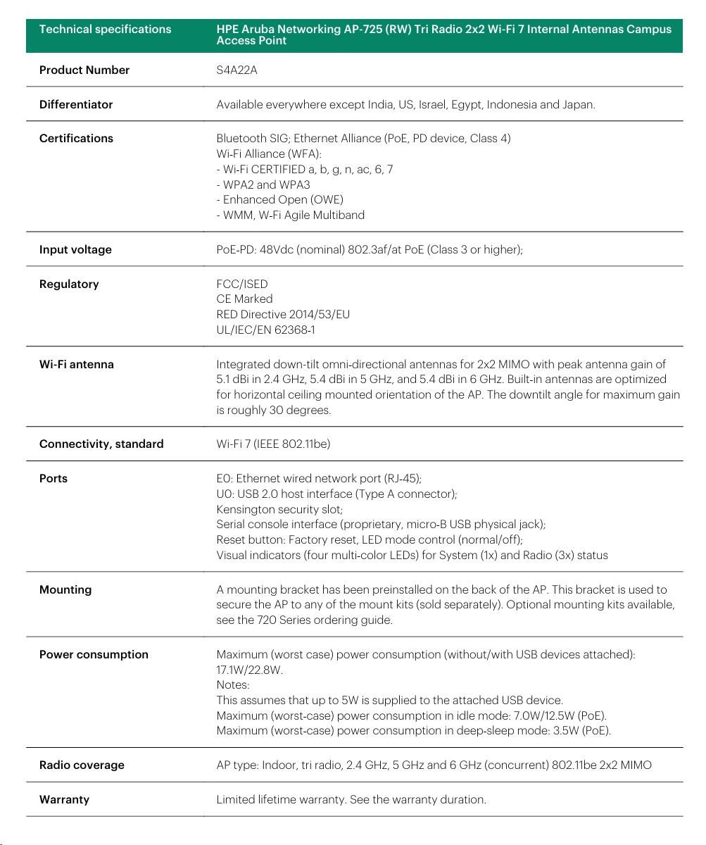 Model: HPE Aruba Networking AP-725 (Internal antenna models)