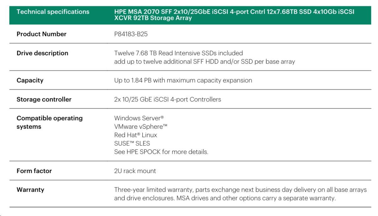 HPE MSA 2070 SFF 2x10/25GbE iSCSI 4pController 12x7.68TB SSD 4x25Gb iSCSI XCVR(4xS0K91A) 92TB Storage Array Smart Choice