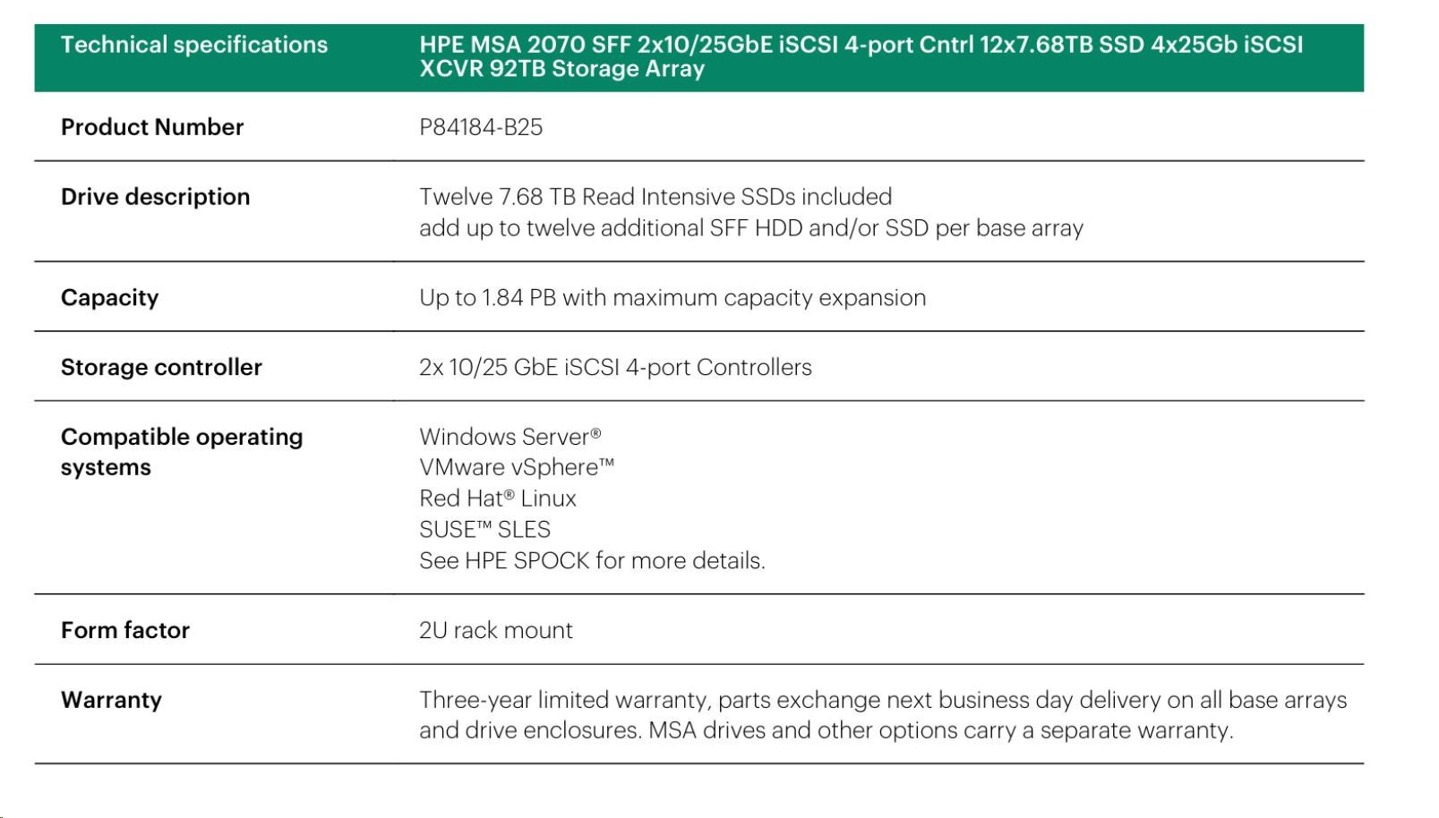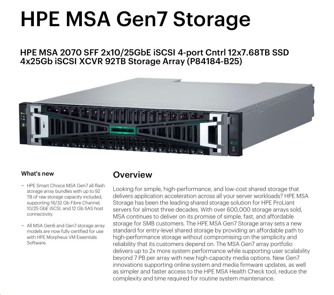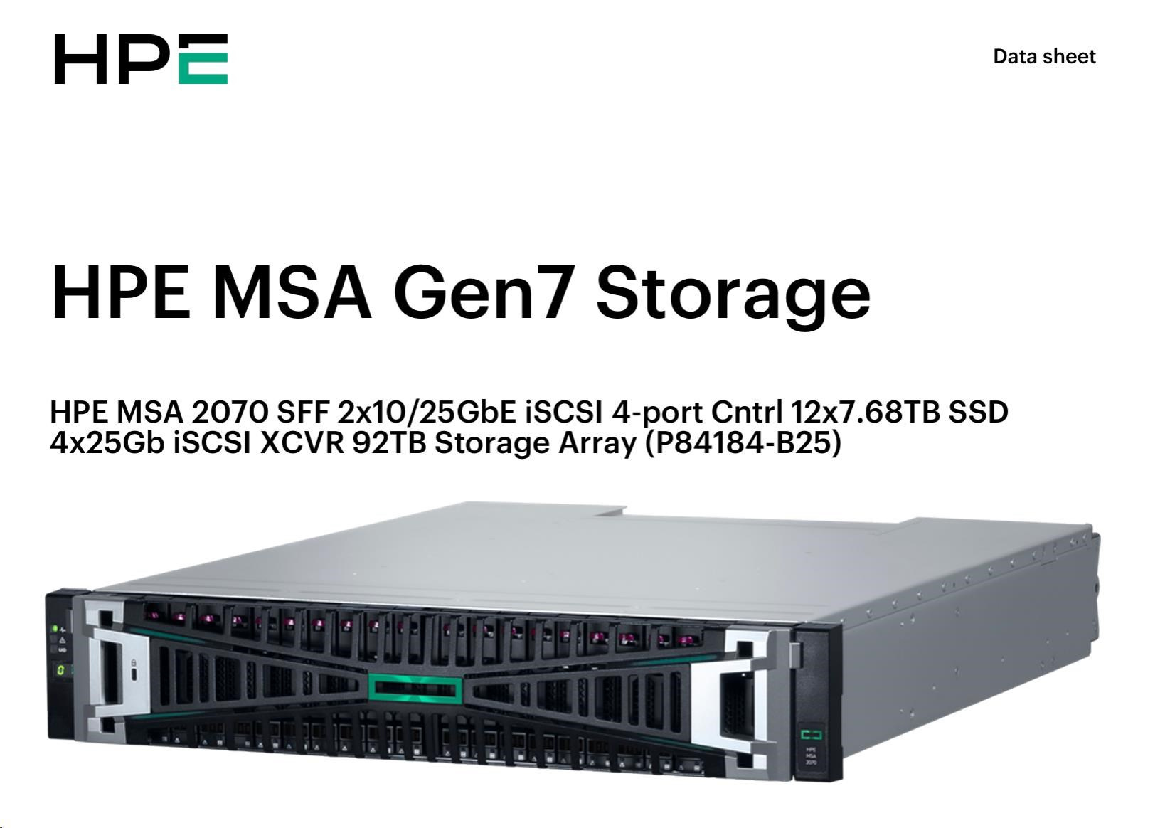 HPE MSA 2070 SFF 2x10/25GbE iSCSI 4pController 12x7.68TB SSD 4x25Gb iSCSI XCVR(4xS0K91A) 92TB Storage Array Smart Choice