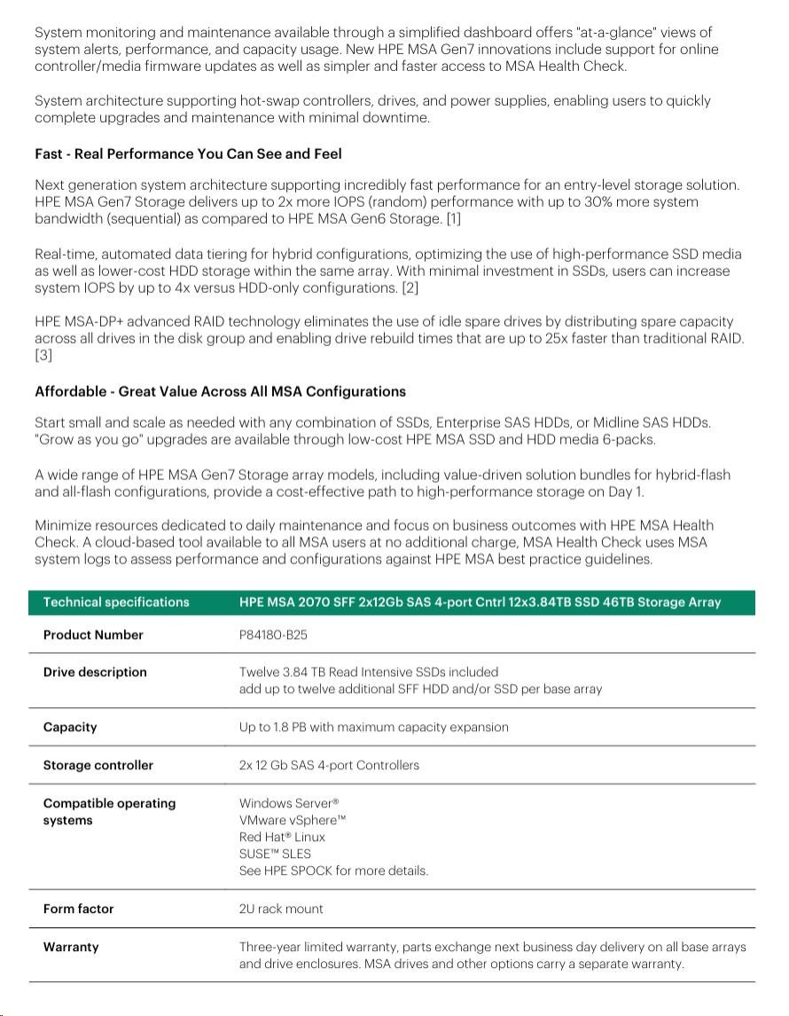 HPE MSA 2070 SFF 2x12Gb SAS 4-port Controller 12x3.84TB SSD 46TB Storage Array Smart Choice