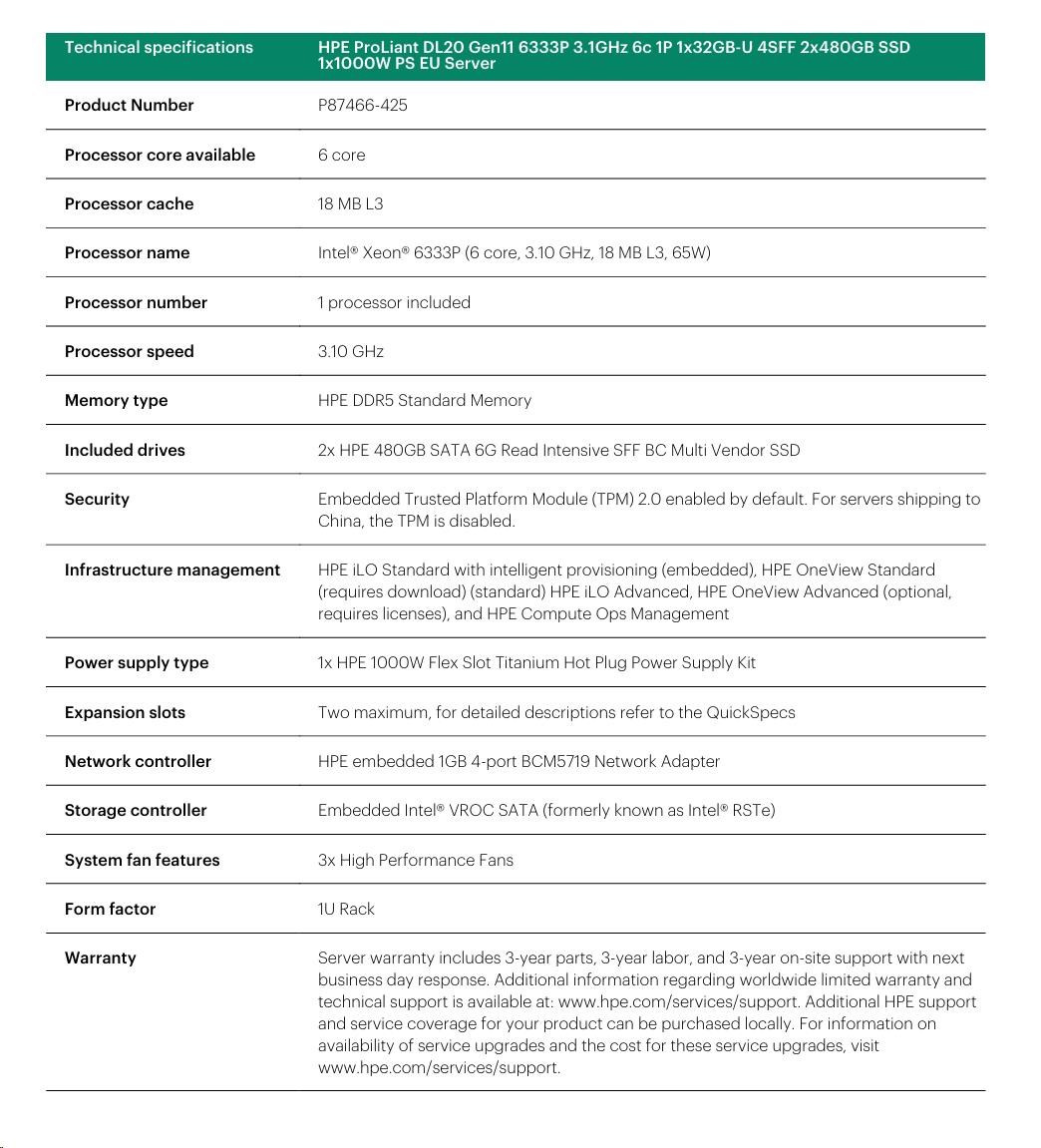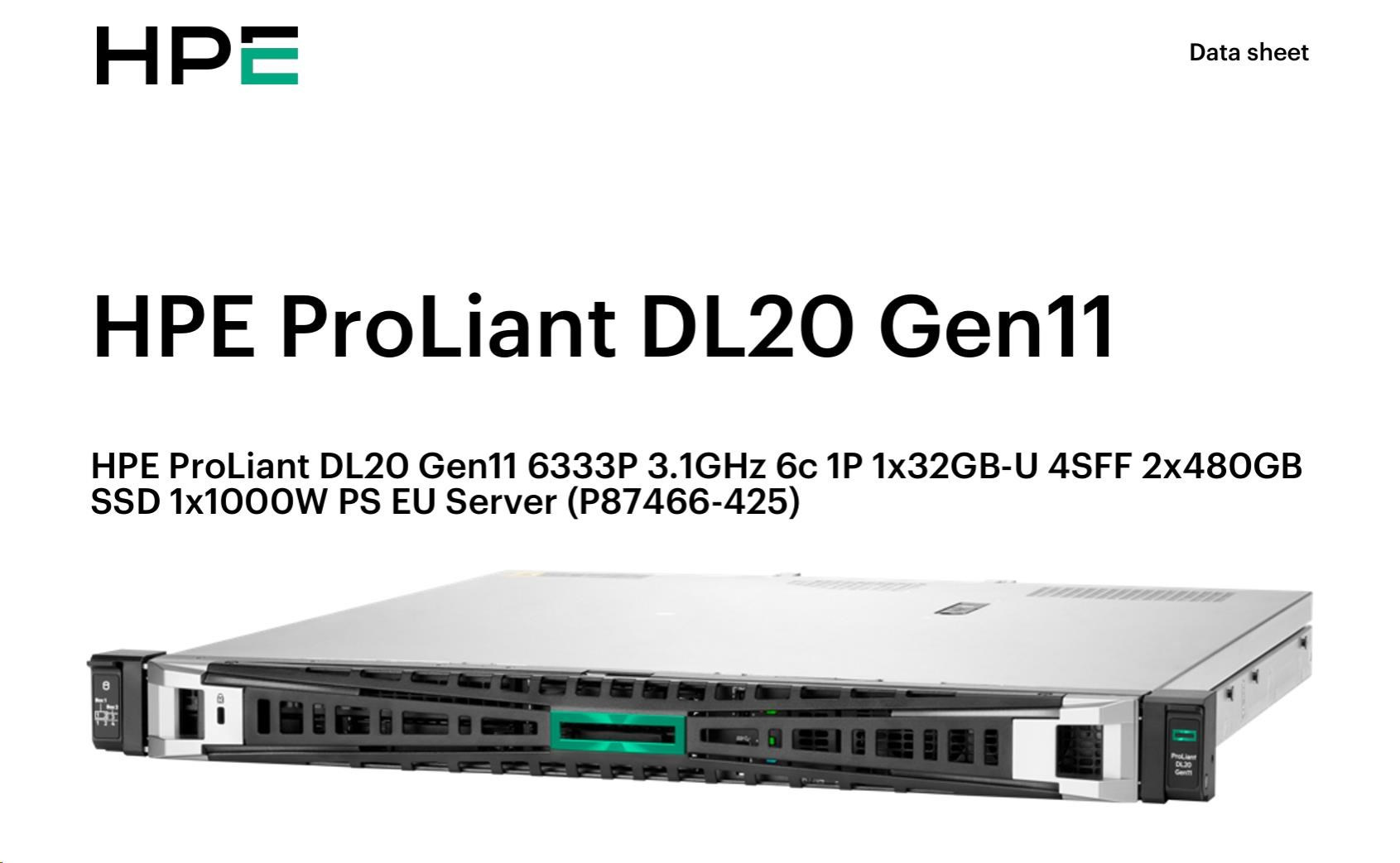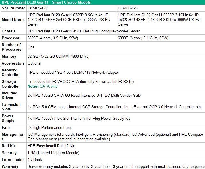 HPE PL DL20g11 6333P (3.1G/6C12T) 1x32G 2x480GB VROC 4SFF 1x1000W 4x1G NBD333 Smart Choice