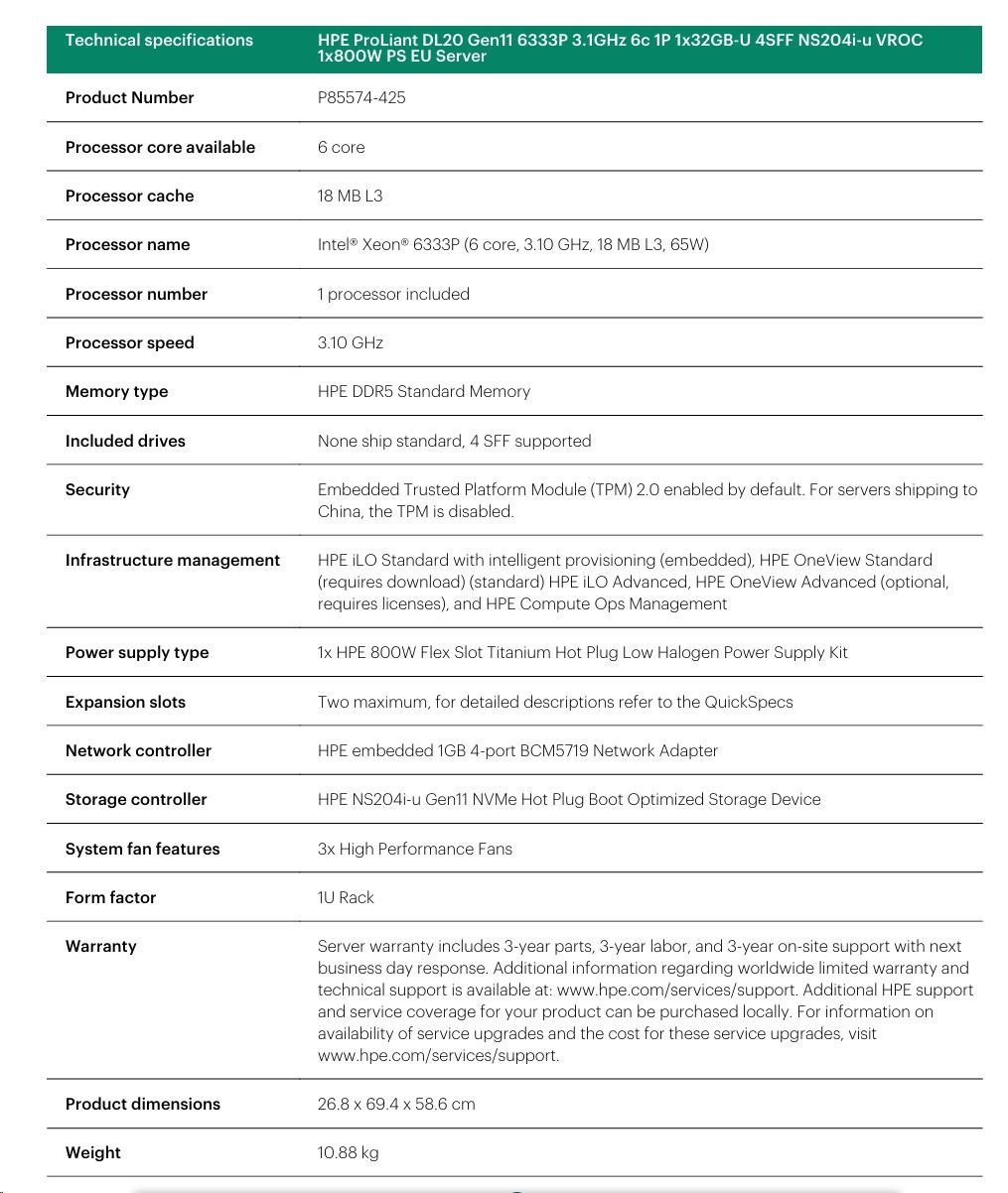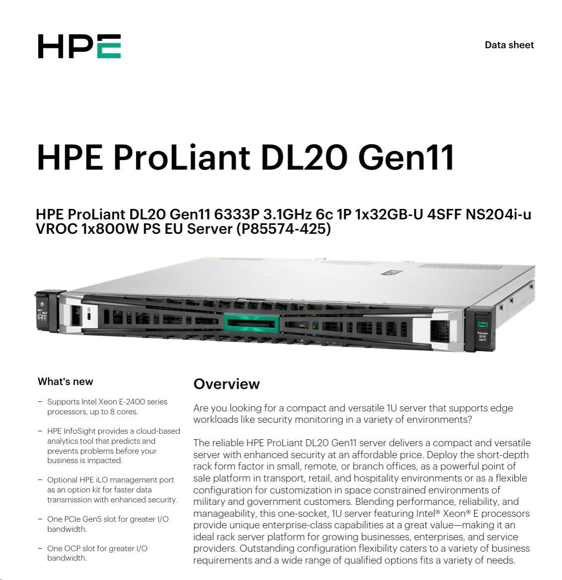 HPE PL DL20g11 6333P (3.1G/6C12T) 1x32G (P64339) NS204(2x480G) 4SFF VROC 1x800W 4x1G NBD333 Smart Choice