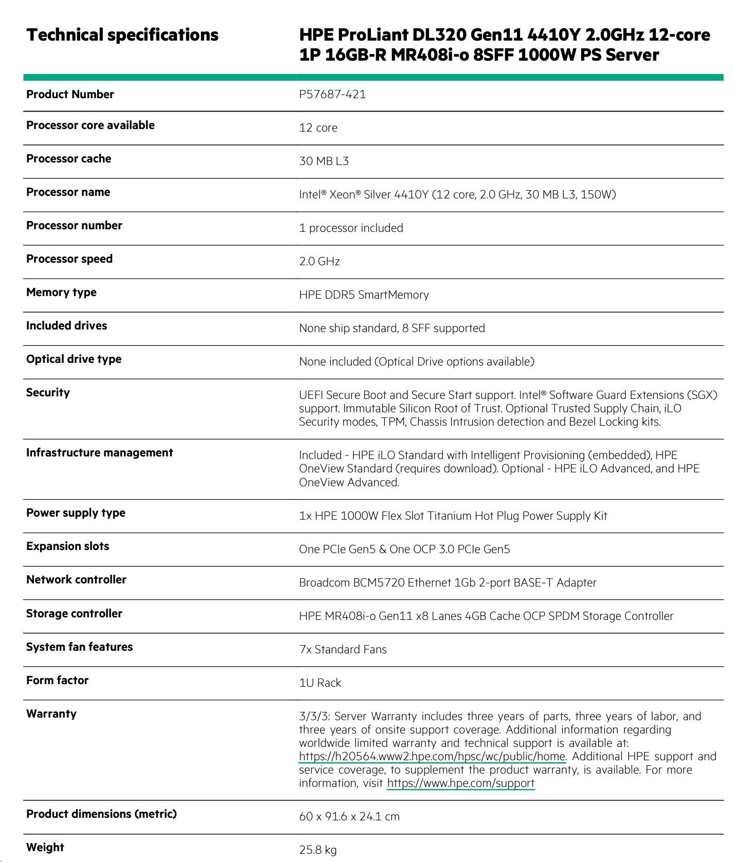 HPE ProLiant DL320 Gen11 4410Y 2.0GHz 12-core 1P 16GB-R MR408i-o 8SFF 1000W PS