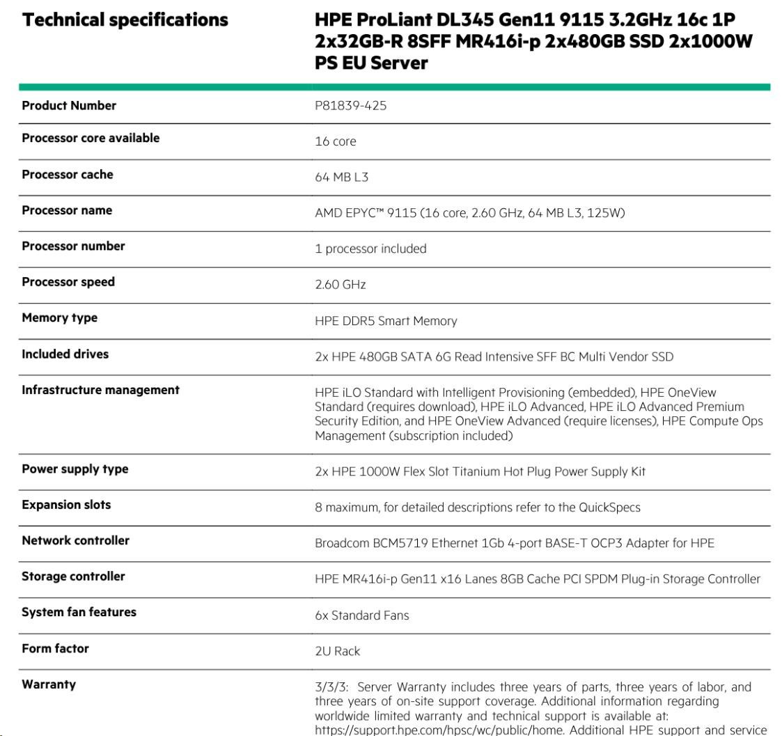 Popis HPE PL DL345g11 AMD Epyc 9115 (2.6G/16C) 2x32G 2x480G (P40497) 2x1000W MR416i-p 8SFF 4p1G Smart Choice