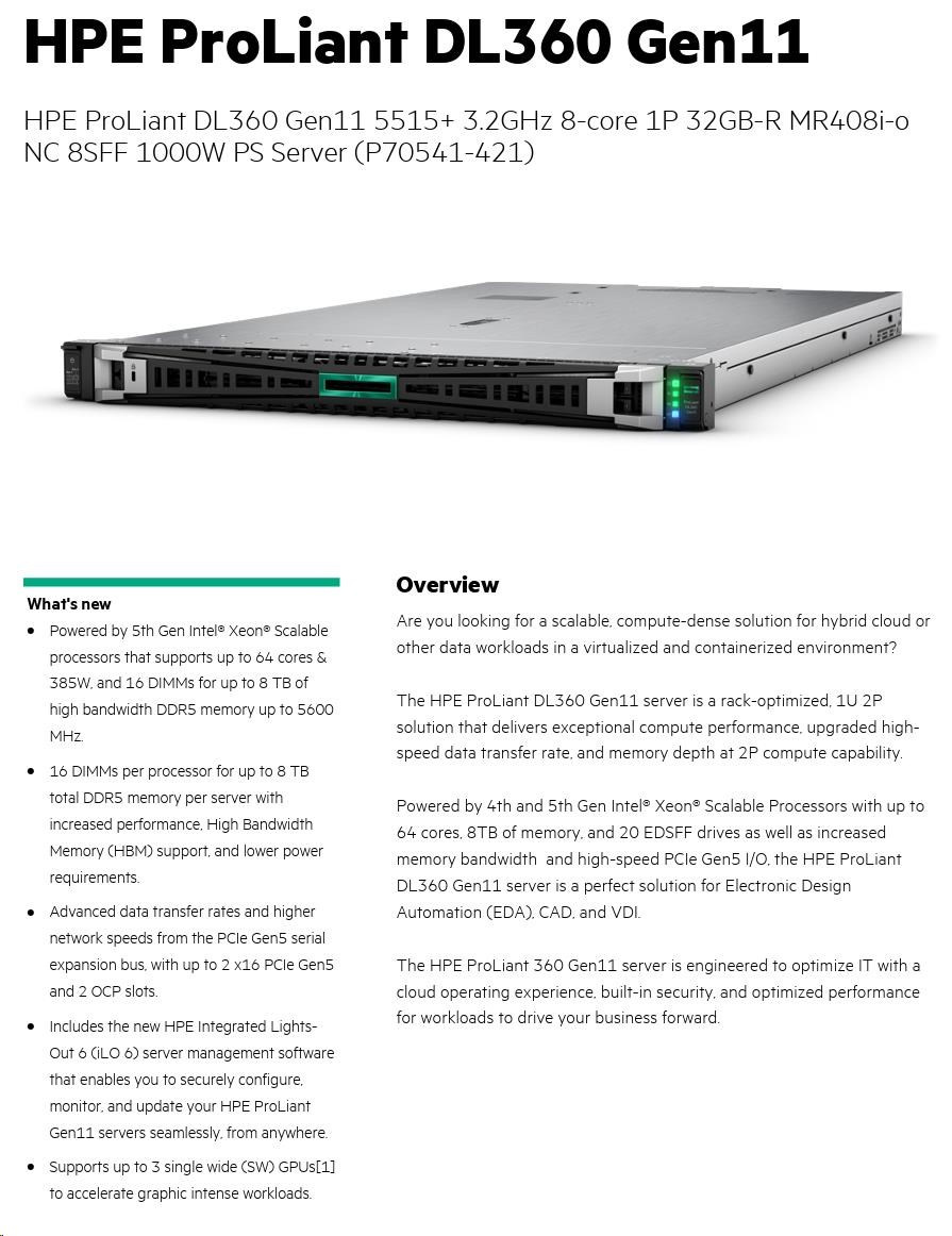 Model Name HPE PL DL360g11 5515+ (3.2/8C/165W) 1x32G MR408i-o/4G 8-10SFF 1x1000W 2x10G-T NBD333 1U