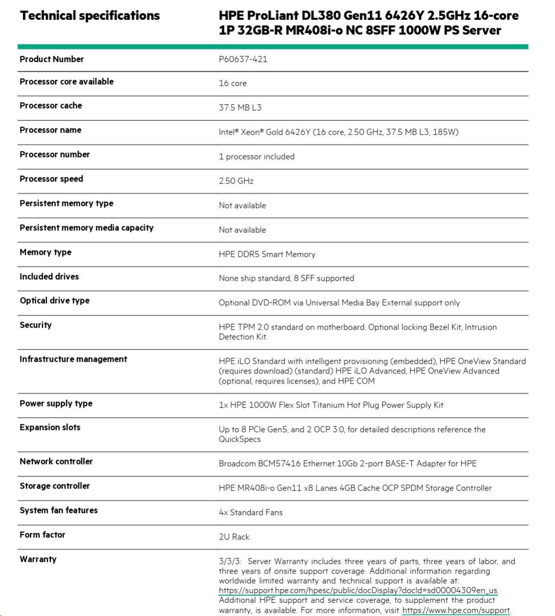 | Warranty | 3 Years Parts / 3 Years Labor / 3 Years Onsite Support Warranty Info HPE Support |