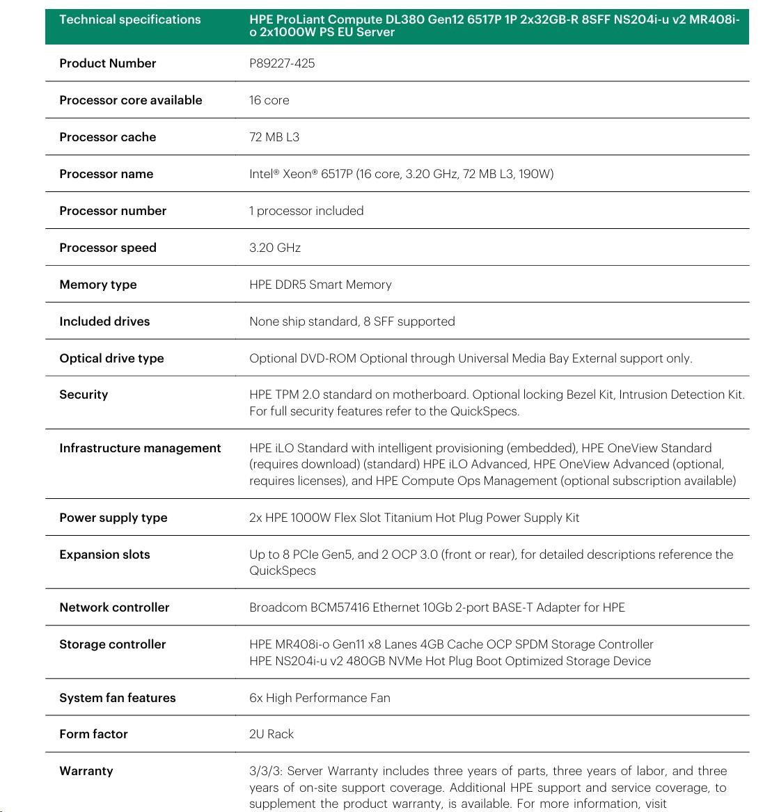 HPE PL DL380g12 6515P (2.4/16C) 2x32G (P69727) 2x480G MR408i-o 8SFF 2x1000W 2p10G-T NBD333 Smart Choice