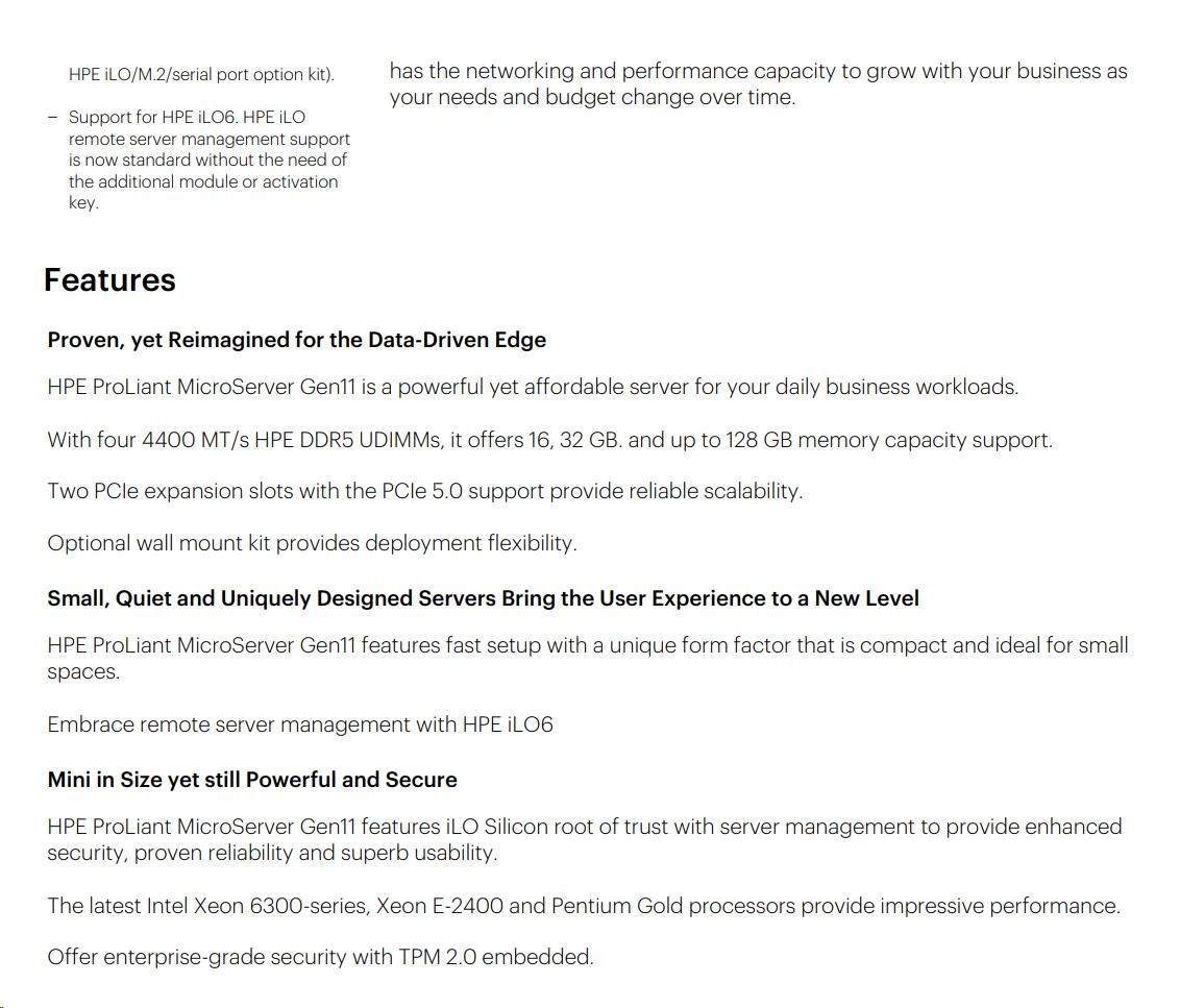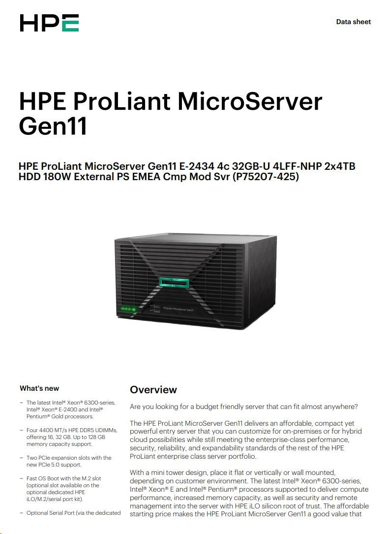 Model Name HPE ProLiant MicroServer Gen11 E-2434 4c 32GB-U 4LFF-NHP 2x4TB HDD 180W External PS EMEA Cmp Mod Svr