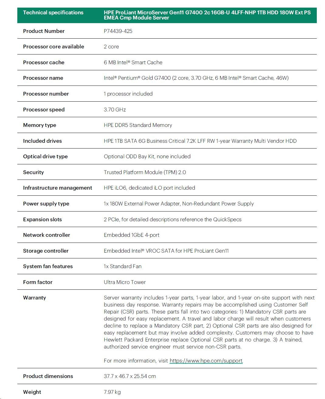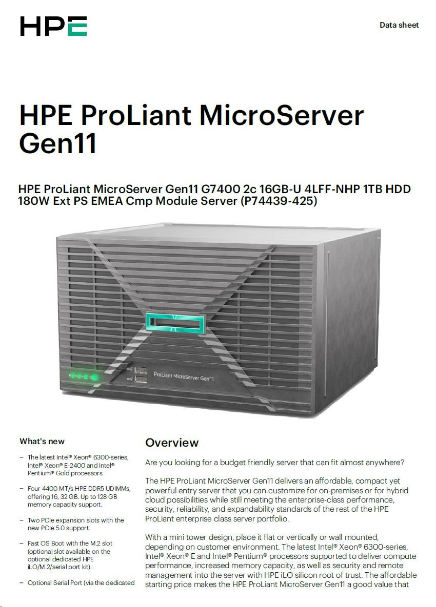 P74439-425: HPE ProLiant MicroServer Gen11 G7400 2c 16GB-U 4LFF-NHP 1TB HDD 180W Ext PS EMEA Cmp Module Server