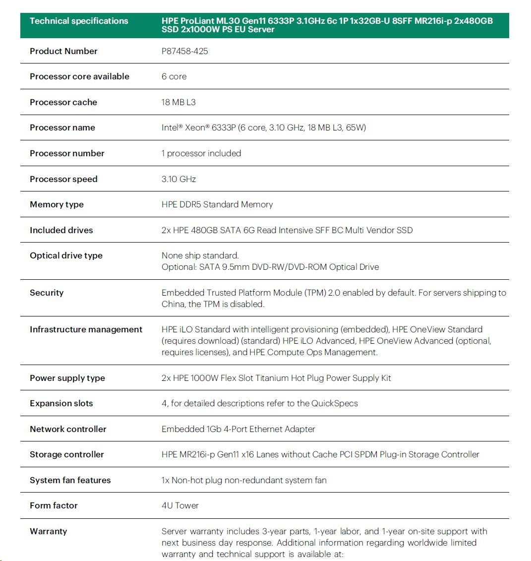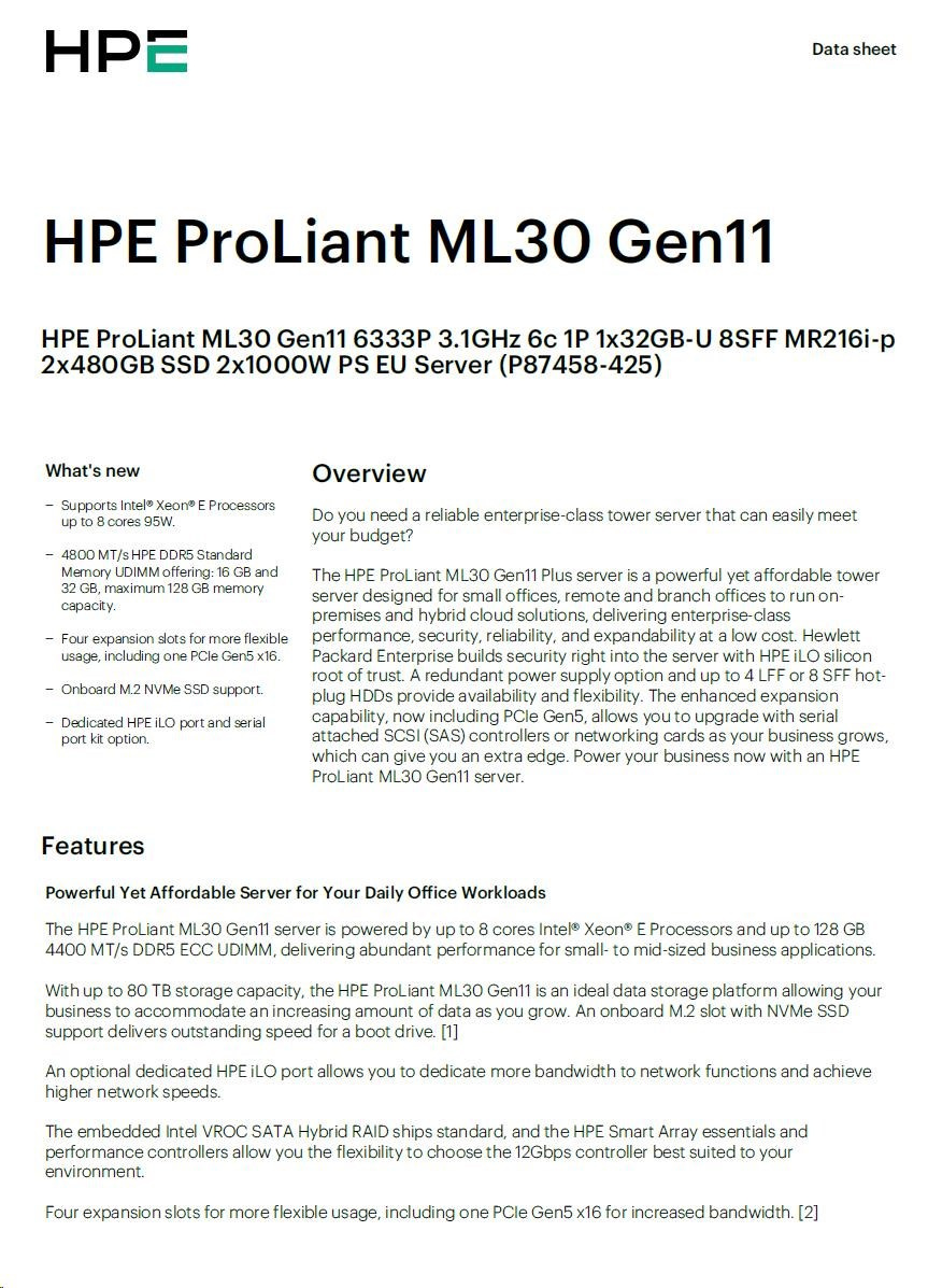 HPE PL ML30g11 6333P (3.1G/6C12T/65W) 1x32G 2x480G 2x1000W MR216i-p 8SFF 4p1G NBD311 Smart Choice