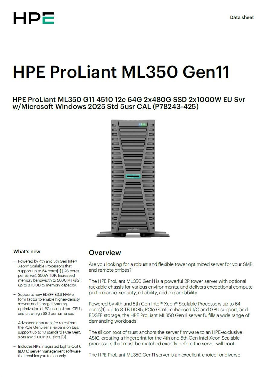 HPE PL ML350g11 4510 (2.4/12C) 2x32G (P64706) 2x480G MR408i 2x1000W SFF 4p1G WS25STD(P77100) +5user(P77112) Smart Choice