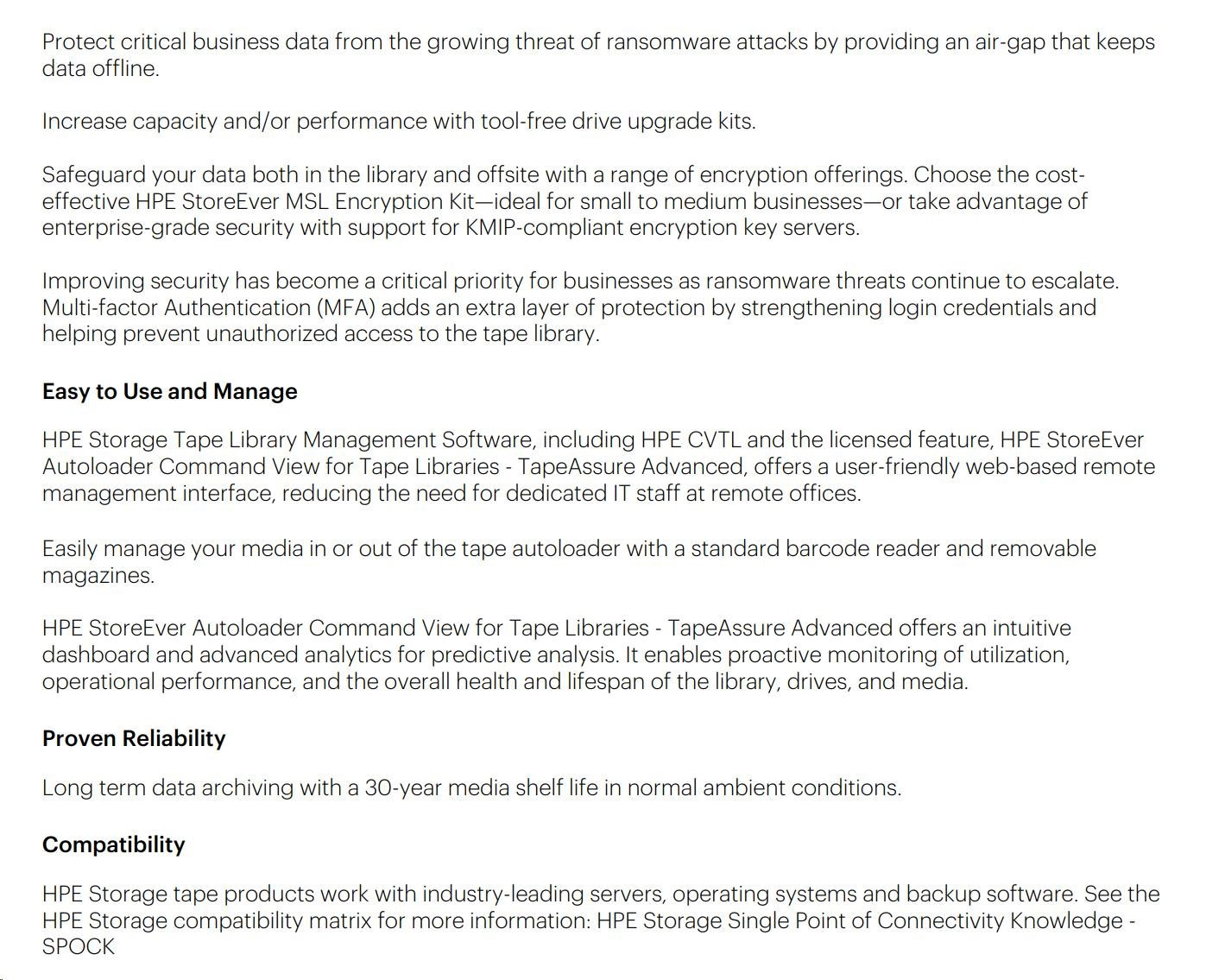 HPE Storage MSL 1/8 Tape Autoloader 1x MSL LTO-9 Fibre Channel 5x LTO-9 45TB Data Cartridges.