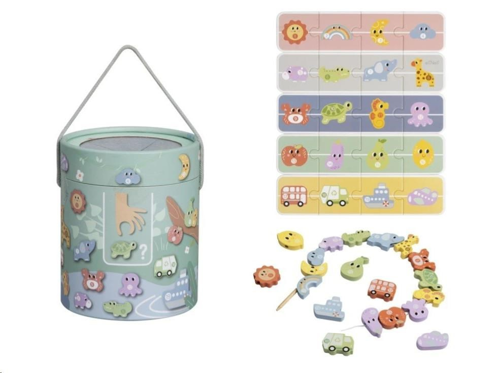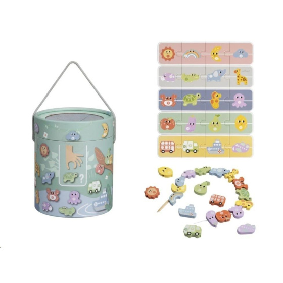 Balenie obsahuje: kyblík, 20 drevených predmetov v podobe očíslovaných zvieratiek, ovocia, dopravných prostriedkov a motívov z oblohy, 20 hracích kartičiek v podobe puzzle, 2 provázky na navliekanie.