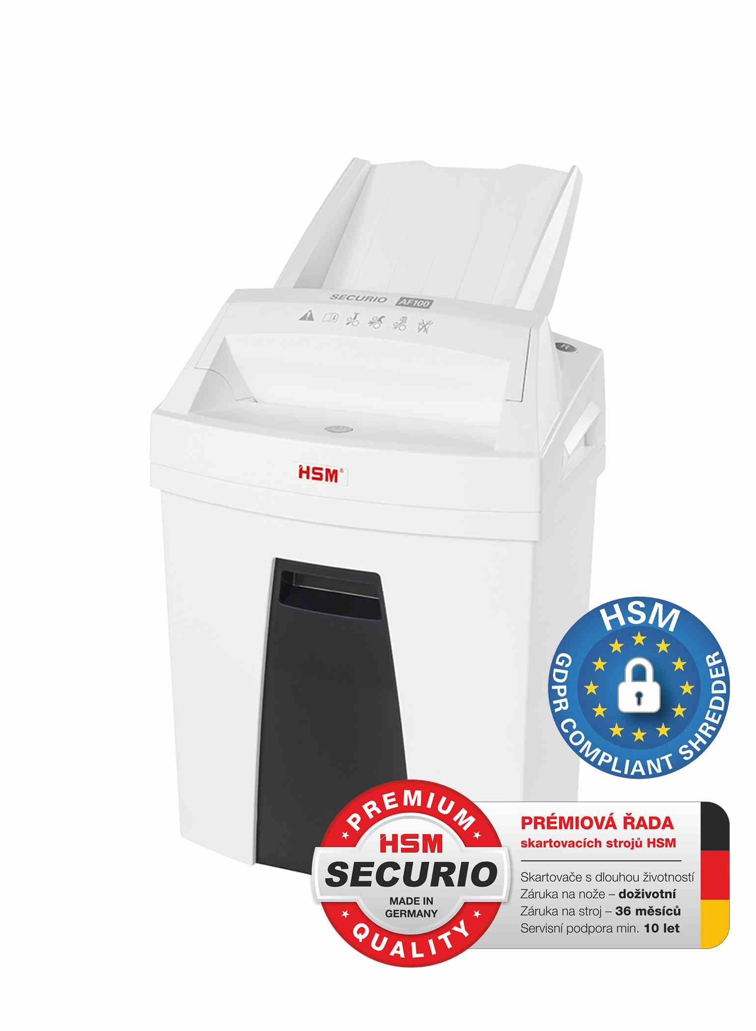 Skartovač HSM Securio AF100 (rez: kombinovaný 4x25 mm | vstup: 225 mm | DIN: P-4 (3) | papier, sponky, plast. karty)