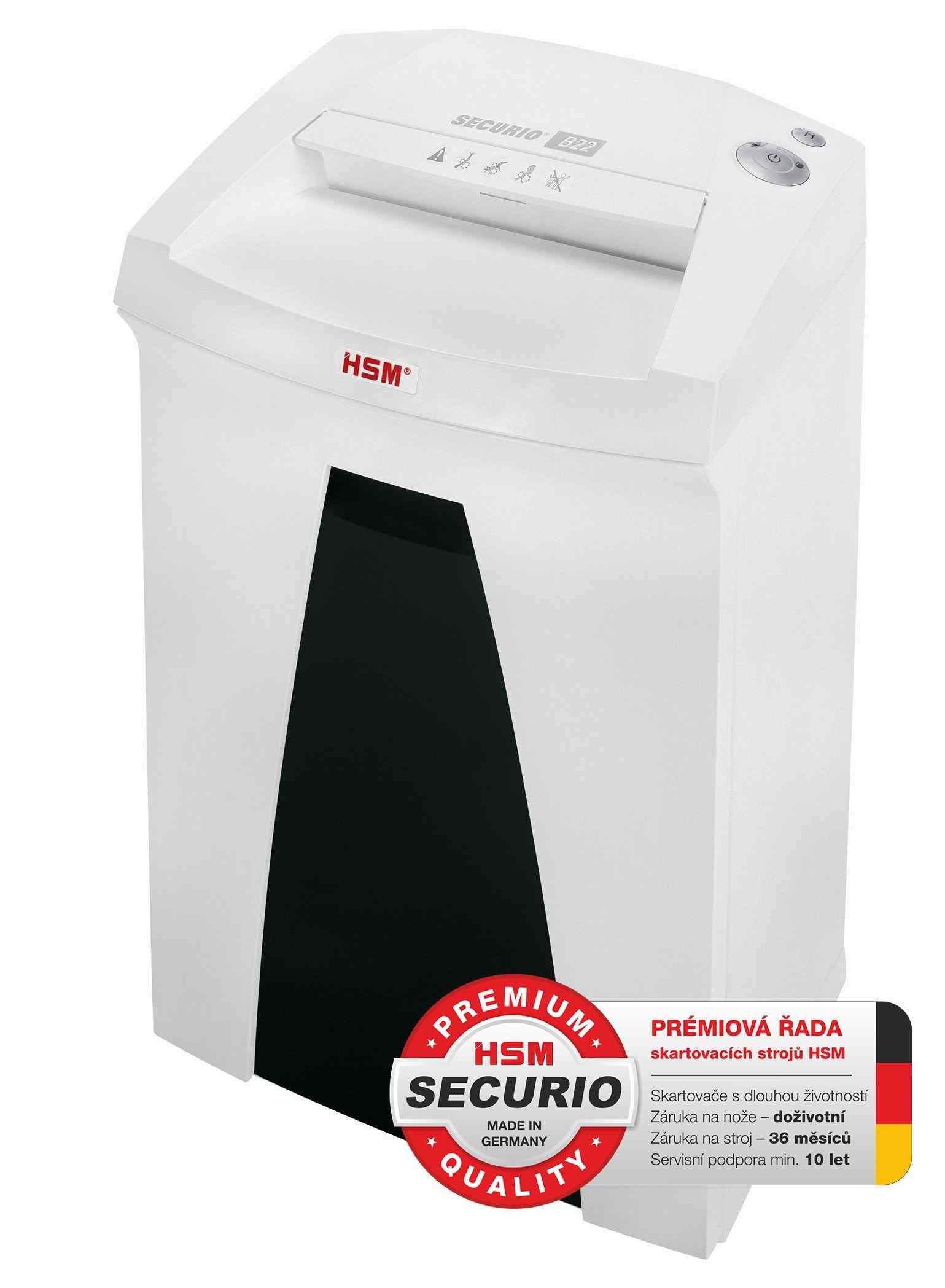 Skartovač HSM Securio B22 (rez: pozdĺžny 5.8 mm | Vstup: 240 mm | DIN: P-2 (2) | papier, sponky, plast. karty, CD)