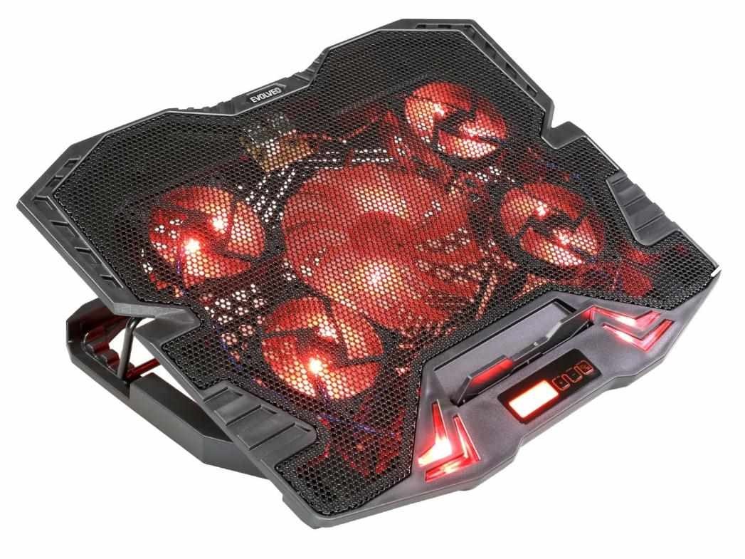Herný nastaviteľný chladiaci stojan pre notebooky do veľkosti 15.6". 1x 120 mm a 4x 60 mm ventilátor. 2x USB 2.0. Regulácia otáčok ventilátora, displej.