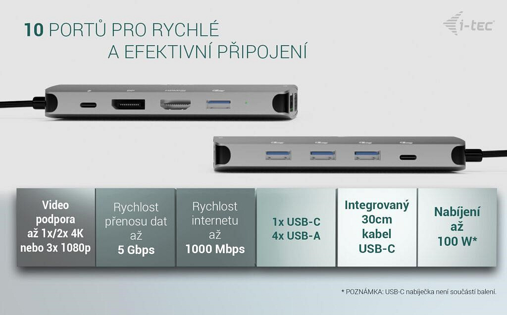 Samozřejmostí je podpora napájení přes USB-C Power Delivery až 100 W**, takže můžete svůj notebook nebo tablet nejen připojit, ale zároveň i nabíjet – vše jedním kabelem.