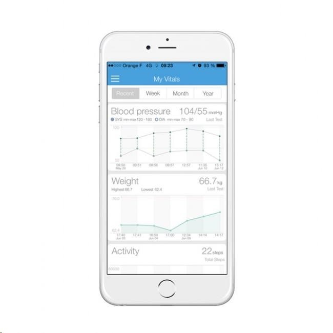 Môžete však bezdrôtovo a v priebehu niekoľkých sekúnd synchronizovať iHealth Track cez Bluetooth 4.0 s aplikáciou iHealth MyVitals vo vašom smartfóne a cloude výrobcu. Aplikácia zaznamenáva neobmedzenú históriu a umožňuje vám zdieľať výsledky s rodinou alebo lekárom.