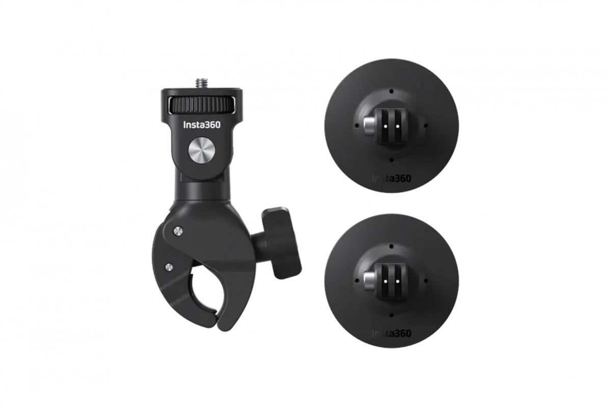 Montážna sada kamery na motorku Insta360. Obsahuje objímku na riadidlá, dva samolepiace držiaky na prilbu, dva adaptéry so statívovým závitom, adaptér s vnútorným statívovým závitom, poistné šrouby a plastové vložky. Súčasťou sady je aj šesťhranný kľúč a utahovací nástroj. Popis produktu bol preložený pomocou umelej inteligencie a môže obsahovať nepresnosti.