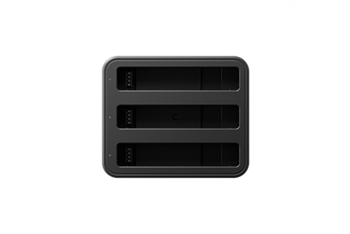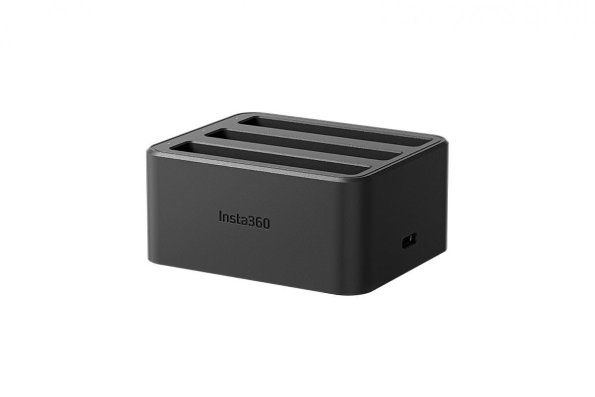 Nabíjací hub pre tri batérie pre kameru Insta360 X4. Hub nabijá 2290 mAh akumulátor za 43 minút (za 26 minút na 80%). Hmotnosť: 109g Rozmery: 75 x 62 x 34 mm