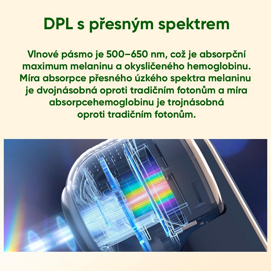 Tento inovatívny prístroj je vašou osobnou zbraňou proti najčastejším nedokonalostiam pleti. Využíva vysoko presné úzke spektrálne svetlo (500–650nm), ktoré cielene pôsobí na melanin (pigmentové škvrny) a hemoglobín (začervenanie). Na rozdiel od bežných IPL prístrojov technológia DPL odfiltruje nežiaduce svetelné spektrum a koncentruje energiu presne tam, kde je potrebné. Vďaka tomu je ošetrenie nielen oveľa účinnejšie, ale tiež bezbolestné a šetrné k vašej pokožke.