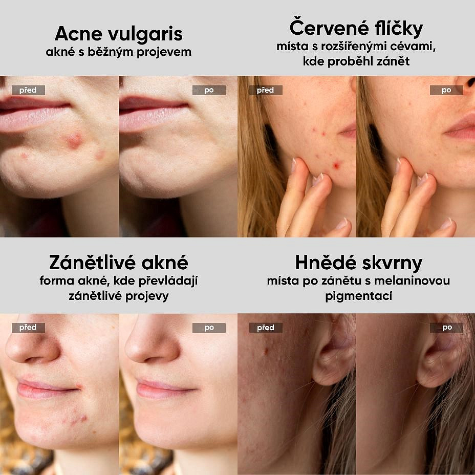 - Pásmo 800-1200nm: Preniká hlbšie do pokožky, kde pôsobí na mazové žľazy. Inhibuje ich nadmernú činnosť, vyrovnáva produkciu mazu a zabraňuje upchávaniu pórov. Zároveň stimuluje regeneráciu kolagénu, čo urýchľuje hojenie a zosvetľovanie jazvičiek po akné.