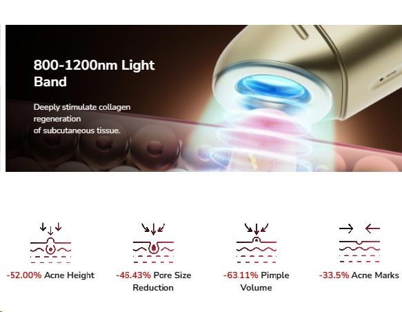• Dvojitá rádiová vlna svetla: Kombinuje dve pásma (400-600nm & 800-1200nm) pre komplexný účinok – ničenie baktérií a reguláciu mazu.
