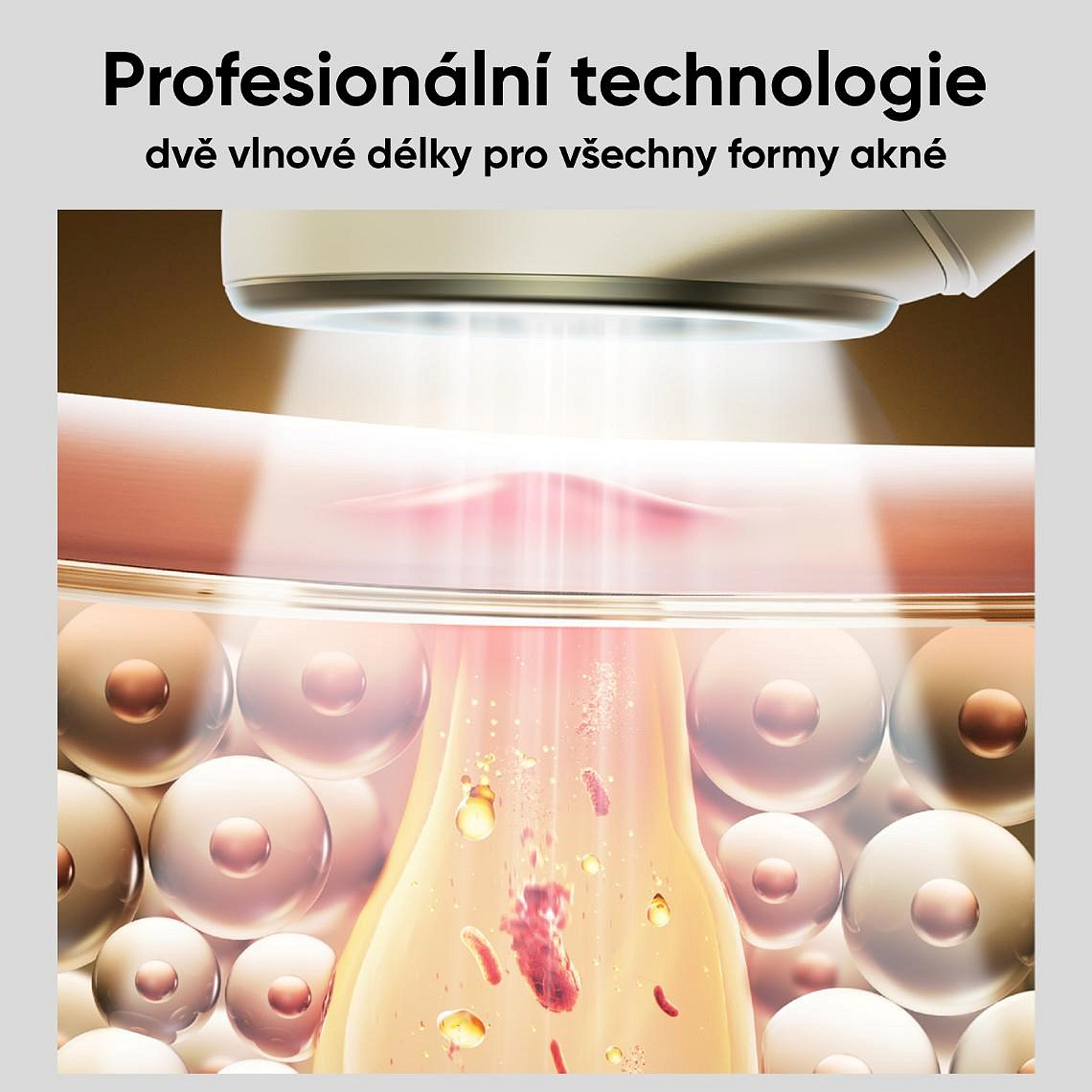 Tento inovatívny prístroj využíva unikátnu "svetelno-biologickú" technológiu na maximálny efekt. Dvojitá rádiová vlna intenzívneho pulzného svetla preniká hlboko do pokožky, kde ničí baktérie Propionibacterium acnes a reguluje produkciu mazu.