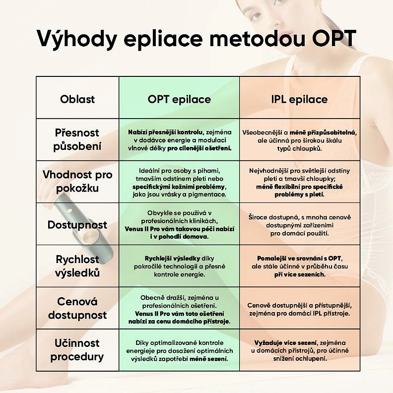JOVS Venus Pro II nie je len ďalší IPL epilátor. Je to prvý hybridný prístroj svojho druhu, ktorý v sebe spája dve kľúčové technológie: účinnú epiláciu OPT (Optimal Pulse Technology) a fotonové omladenie pleti (SR). Vďaka šiestim špecializovaným režimom pre rôzne časti tela a šiestim úrovniam intenzity prístroj presne cieli na korienky chĺpkov s optimálnou vlnovou dĺžkou a energiou. Výsledkom je o 60 % efektívnejšie a dlhodobejšie odstránenie chĺpkov bez poškodenia okolitej pokožky.