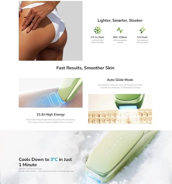 Predstavte si, že už za 4 týždne uvidíte viditeľnú redukciu chlpov a vaša pokožka bude hodvábne hladká. Unikátna chladivá technológia, ktorá udržiava teplotu hlavice na príjemných 10 °C, zabezpečuje naprosto bezbolestné ošetrenie od začiatku do konca. To všetko je zabalené v unikátnom, kompaktnom a ľahkom dizajne (len 286 g), ktorý je inšpirovaný eleganciou starovekých svitkov a je dokonalým spoločníkom na cesty.