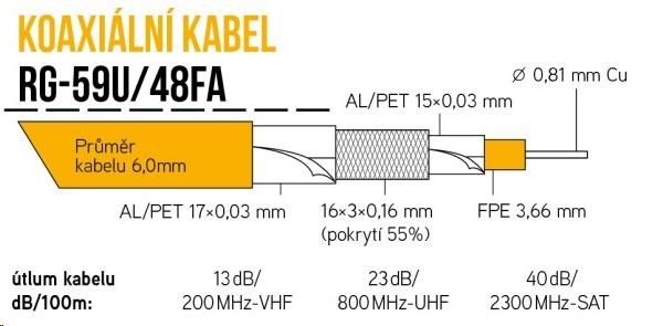 Balenie: na cievke 100 m, plášť kábla: PVC biely, priemer kábla: 6 mm Použitie a špecifikácie: - použitie na vnútorné rozvody v budovách (PVC plášť) - prívody kamier PAL alebo HD-CVI/TVI do 300 m - sekundárne a sekundárne káblové rozvody CCTV pre obytné budovy do 40 m - sekundárne a sekundárne káblové rozvody DVB-T/T2 pre obytné budovy do 40 m - sekundárne a sekundárne káblové rozvody DVB-S/S2 pre obytné budovy do 40 m - impedancia kábla 75 Ohm - celomedené jadro s priemerom 0,81 mm - trieda účinnosti tienenia B/A (UHF) - trojité tienenie a úroveň pokrytia zaručujú vynikajúcu odolnosť proti vonkajšiemu rušeniu ..