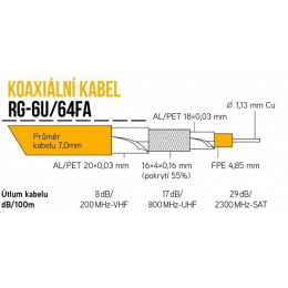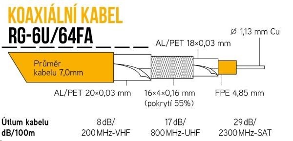 Balenie: na cievke 100 m, plášť kábla: PVC biely, priemer kábla: 7 mm Použitie a špecifikácie: - použitie na vnútorné rozvody v budovách alebo v kombinovanom prostredí (PVC-UV plášť) - dlhé kamerové rozvody PAL alebo HDCVI/TVI do 500 m - hlavné a primárne pozemné rozvody DVB-T/T2 do 70 m - hlavné a primárne satelitné rozvody DVB-S/S2 do 70 m - impedancia kábla 75 Ohm - priemer celomedeného jadra 1,13 mm - trieda účinnosti tienenia A/A+(UHF) - trojité tienenie a úroveň pokrytia zaručujú veľmi vysokú odolnosť voči vonkajšiemu rušeniu ..
