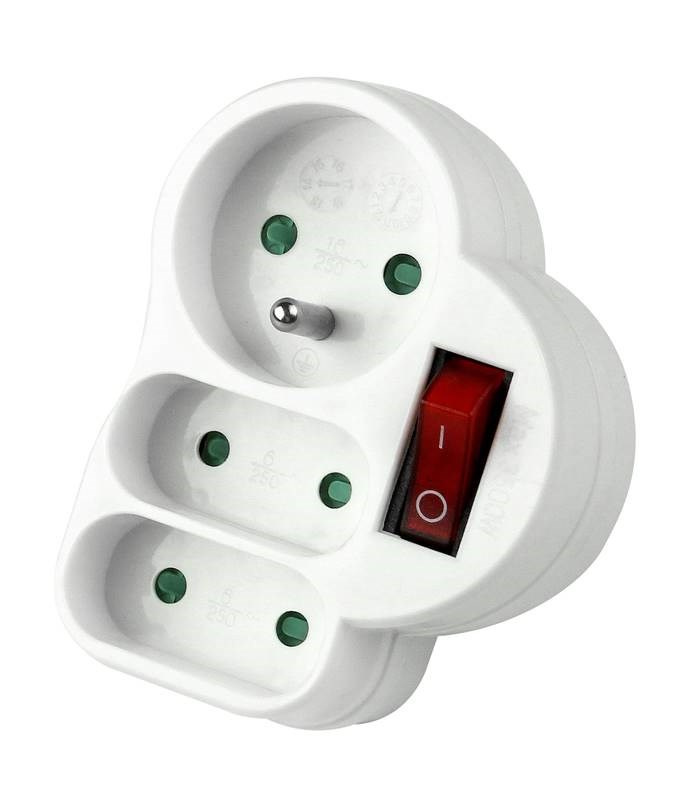 1 x kulatá + 2 x plochá zásuvka s vypínačem 250 V~/ 2x6A 1x10A. Max 3500W. Detská ochrana-clonky.