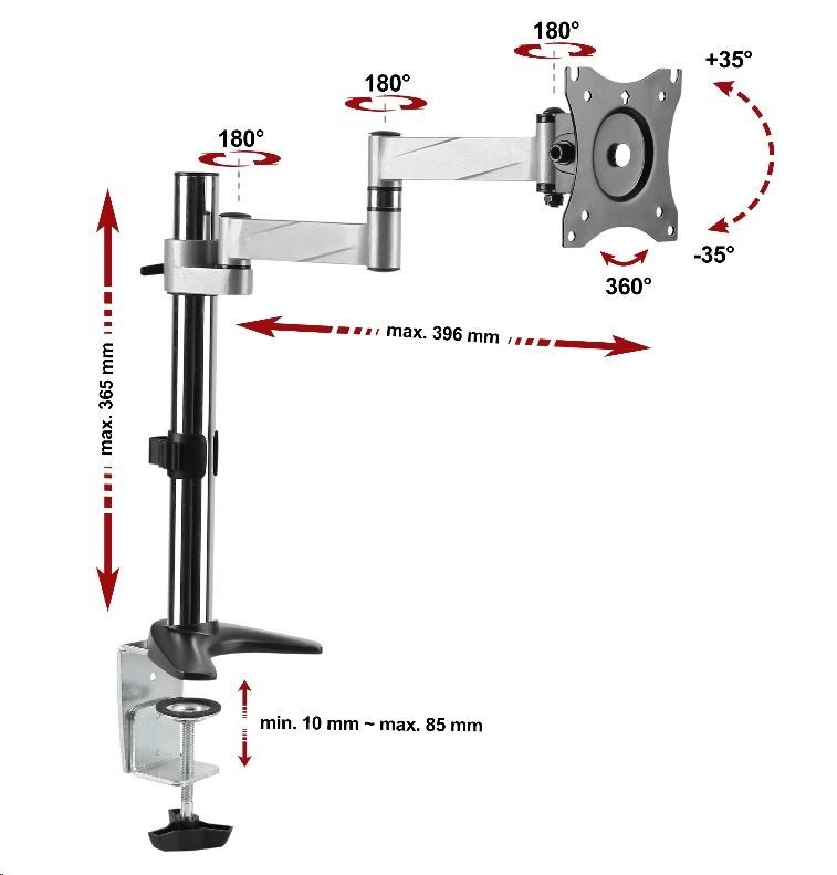 Technické údaje: nosnosť 8kg plne nastaviteľný - 3D polohovanie monitora pre monitory s uhlopriečkou 13" až 27" podpora VESA 75x75 a 100x100 otáčanie do strán +/- 180° nakoľko +/- 35° rotácia obrazovky +/- 180° - funkcia PIVOT nastavenie vzdialenosti od nosníka 0mm až 396mm nastavenie výšky max. 364mm ukotvenie na stolové dosky s priemerom 10mm až 85mm dva typy ukotvenia na stolové dosky - svorka na okraj stola alebo skrz dosku kamkoľvek do priestoru krásny vzhľad - chrómový nosník, ramená v striebornej úprave materiál hliník výborná kvalita, spoľahlivosť a dlhá životnosť inštalačný materiál súčasťou balenia záruka 3 roky