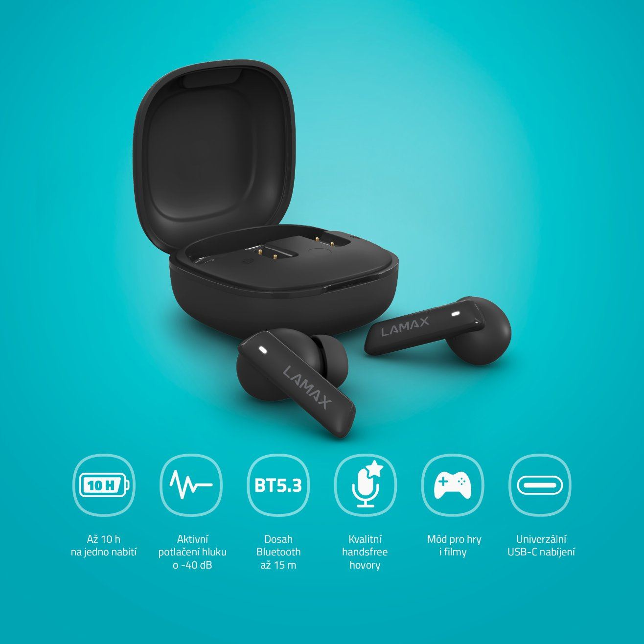 Nová definícia dokonalého zvukuKeď potrebujete uniknúť z monotónnosti všedných dní a ponoriť sa do vlastnej ríše, nehľadajte nič iné ako slúchadlá LAMAX Clips1 ANC. Tieto bezdrôtové slúchadlá do uší s najmodernejšou hybridnou technológiou ANC predstavujú dokonalé riešenie na elimináciu okolitého hluku a zaručujú nerušený a kvalitný zážitok z počúvania. Vďaka intuitívnemu režimu Transparency Mode sa môžete okamžite spojiť s okolím a s výdržou až 10 hodín nepretržitého prehrávania a ďalších 34 hodín z puzdra sú tieto slúchadlá prísľubom neprerušovanej blaženosti. Nabíjanie je pohodlné pomocou priloženého kábla USB-C a najnovšia technológia Bluetooth 5.3 poskytuje okamžité párovanie bez námahy. Slúchadlá poskytujú špičkovú čistotu zvuku prostredníctvom kodeku AAC a herný režim s nízkou latenciou výrazne zvyšuje pôžitok z hier a filmov. Zvuk môžete bez námahy spravovať pomocou dotykových ovládacích prvkov na slúchadlách a počas hovorov a používania hlasového asistenta si môžete vychutnať pozoruhodnú kvalitu čistoty zvuku zabudovaného mikrofónu.
