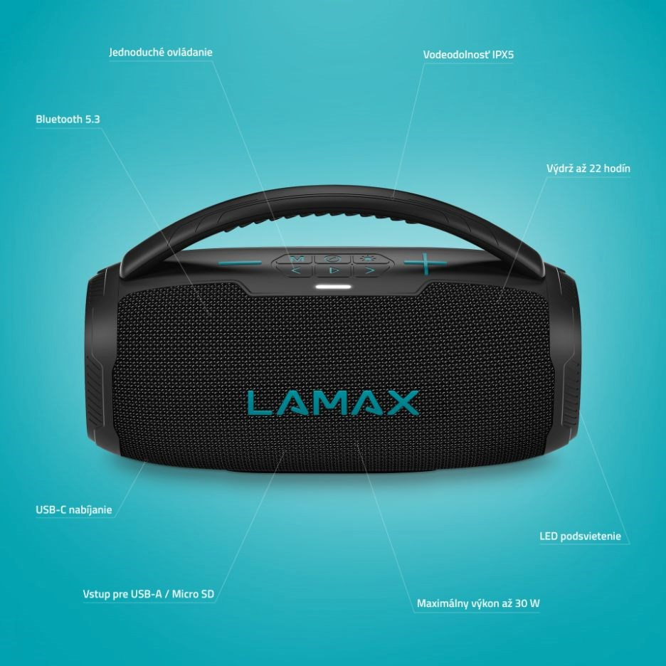Ľahko prenosný LAMAX PartyGo1 Mini so šikovným madlom ti svojim výkonom až 30 W a čistým vyrovnaným zvukom spríjemní pohodové chvíľky doma, pri športe, ale tiež sedánky s kamošmi a menšie párty. Na pohodu ho môžeš vziať kamkoľvek potrebuješ, spoločnosť aj teba vydrží baviť až 22 hodín. A keď dôjde šťava? Pripichni reprák na USB-C a za pár hodín frčíš ďalej. Áno a nejaký dáždik mu nevadí, krytie IPX5 toto zvláda.