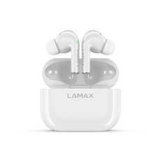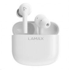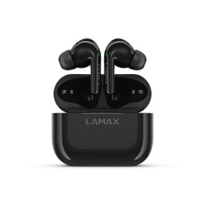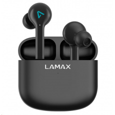True Wireless sluchátka LAMAX Dots3, výdrž 9 hodin na jedno nabití a celkem 40 hodin, nejnovější Bluetooth 5.3, herní a filmový režim s nízkou latencí, kvalitní mikrofon, gumový nástavec na sport, LAMAX BeatBass® technologie, USB-C, dotykové ovládání, podpora iOS a Android, instantní párování, podpora mobilních asistentů, malé skladné rozměry.