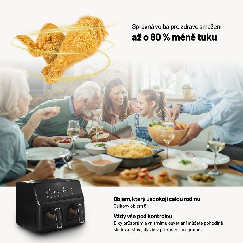 Nestrácajte čas a pripravte hlavné jedlo s prílohou súčasneSmažené nemusí nutne znamenať nezdravé. S digitálnou fritézou Lauben DualZone Air Fryer 8000BC si môžete na svojich obľúbených chrumkavých pokrmoch pochutiť s čistým svedomím. Pri slove fritéza sa väčšine z nás vybaví tuk a zápach. S teplovzdušnou fritézou Lauben smaženie prebieha na míle ďaleko od oboch. Táto fritéza funguje na princípe 360° cirkulácie horúceho vzduchu, ktorý jedlo ohrieva zo všetkých smerov, a nie je tak treba použiť takmer žiaden tuk. Fritézu Lauben sme vybavili dvoma vnútornými košíkmi, s celkovou kapacitou 8 l. Tvorí tak ideálneho spoločníka pre rodiny s deťmi či stretnutie s priateľmi. Oba košíky disponujú vyberacími táckami, ktoré je možné umývať v umývačke, čo uľahčuje údržbu a šetrí čas. Určite tiež oceníte možnosť nastavenia každého z košov zvlášť. Vďaka technológii DualZone® nemusíte držať na uzde svoju predstavivosť. Precíznosť tejto technológie zaručuje dokonalé výsledky pri každom varení, s absolútnou presnosťou udržuje totiž zadanú teplotu a stráži zároveň čas oboch fritovacích košov, a vy sa tak po vybraní požadovaného programu nemusíte už o nič starať.