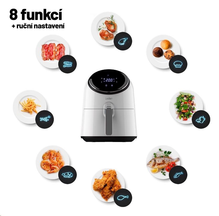 Pri príprave jedla s horkovzdušnou fritézou Lauben máte na výber z 8 režimov, ktoré sú prispôsobené konkrétnym surovinám. Ak si nevyberiete, je možné si nastaviť požadovanú teplotu a dobu vyprážania podľa vlastných preferencií. Tak či tak, výsledkom vždy budú rovnomerne opečené suroviny s chrumkavým finishem, či už pripravujete slaninu k anglickej raňajke, krevety v tempure alebo poctivé domáce hranolky.